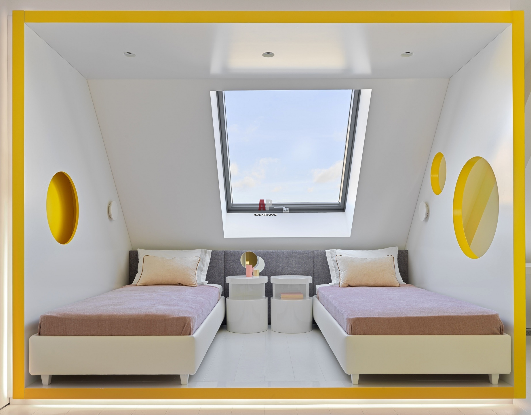 Спальная зона в детской вписана в скос кровли и решена как домик. В этом «домике» есть все: окно, светильники, розетки с выключателями.