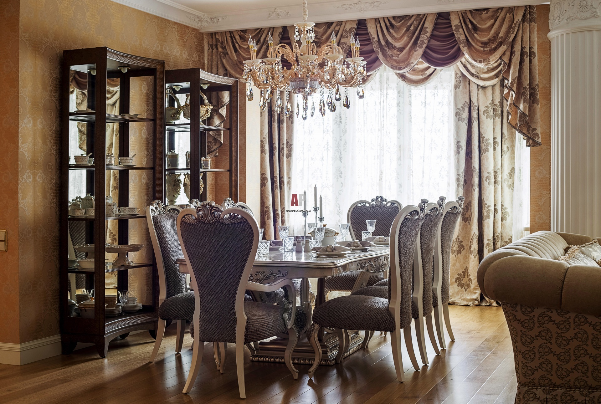 Зона столовой в общей гостиной выдержана в парадной классике.