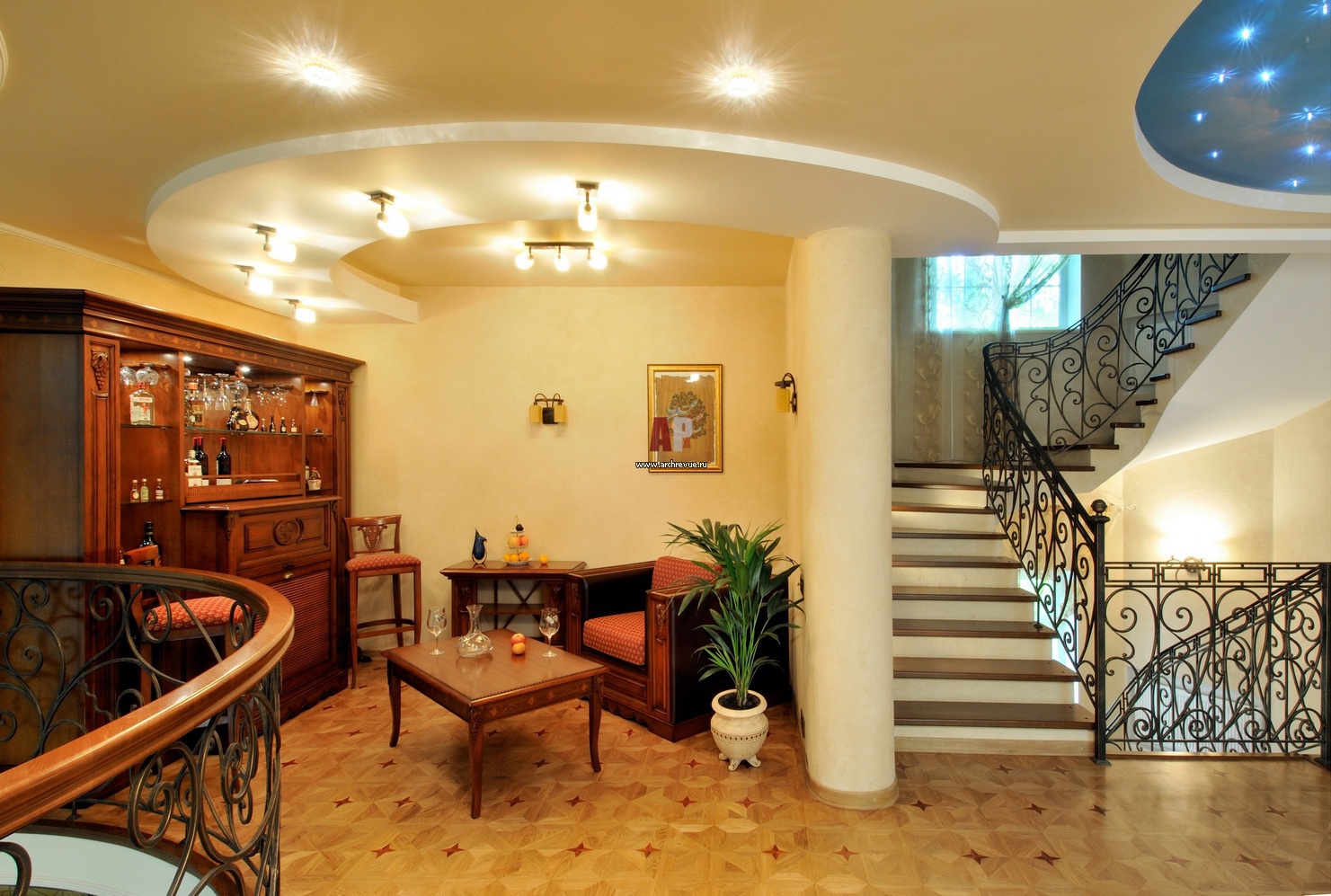 Работа с пластикой потолка и способами освещения во всех зонах этого дома позволяет автору создавать самые разнообразные ощущения от мягкого уюта у домашнего очага до взволнованных ожиданий сказочного мира.