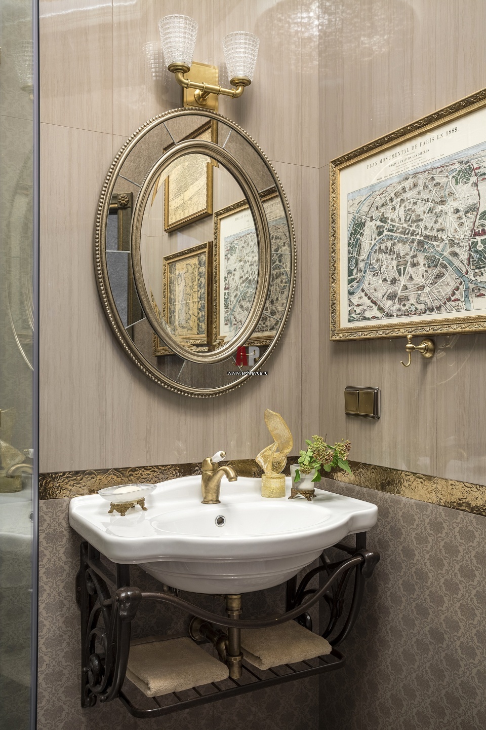 В интерьере санузла выдержана парадная классическая линия. Сантехника, Globo. Зеркало в раме в овальной раме с эффектом старения, Uttermost, Бра, Hudson Valley Lighting со стеклянными призматическими плафонами в отделке из состаренной латуни.