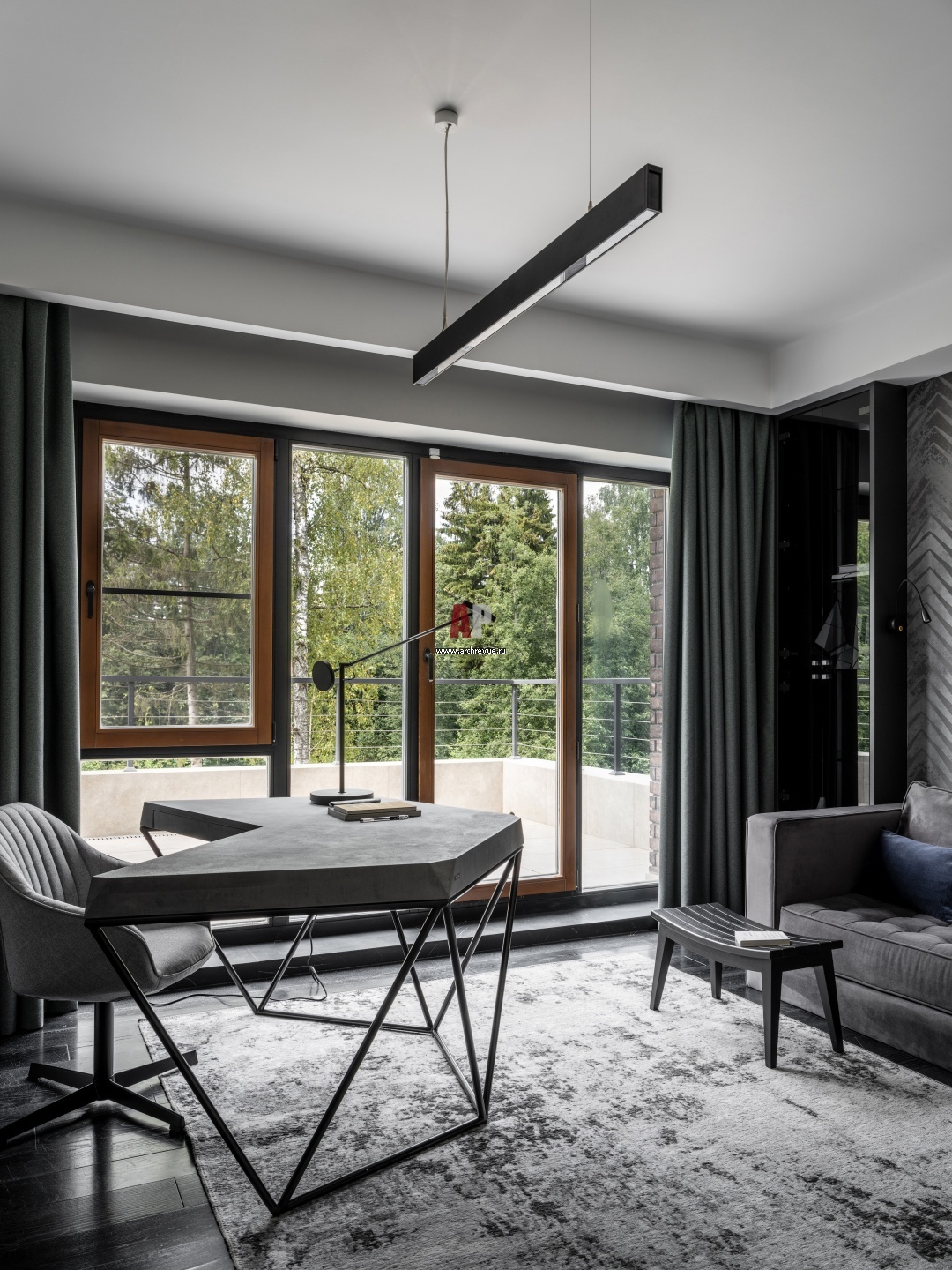 Хозяйский кабинет оформлен в палитре графита и имеет выход на террасу.
