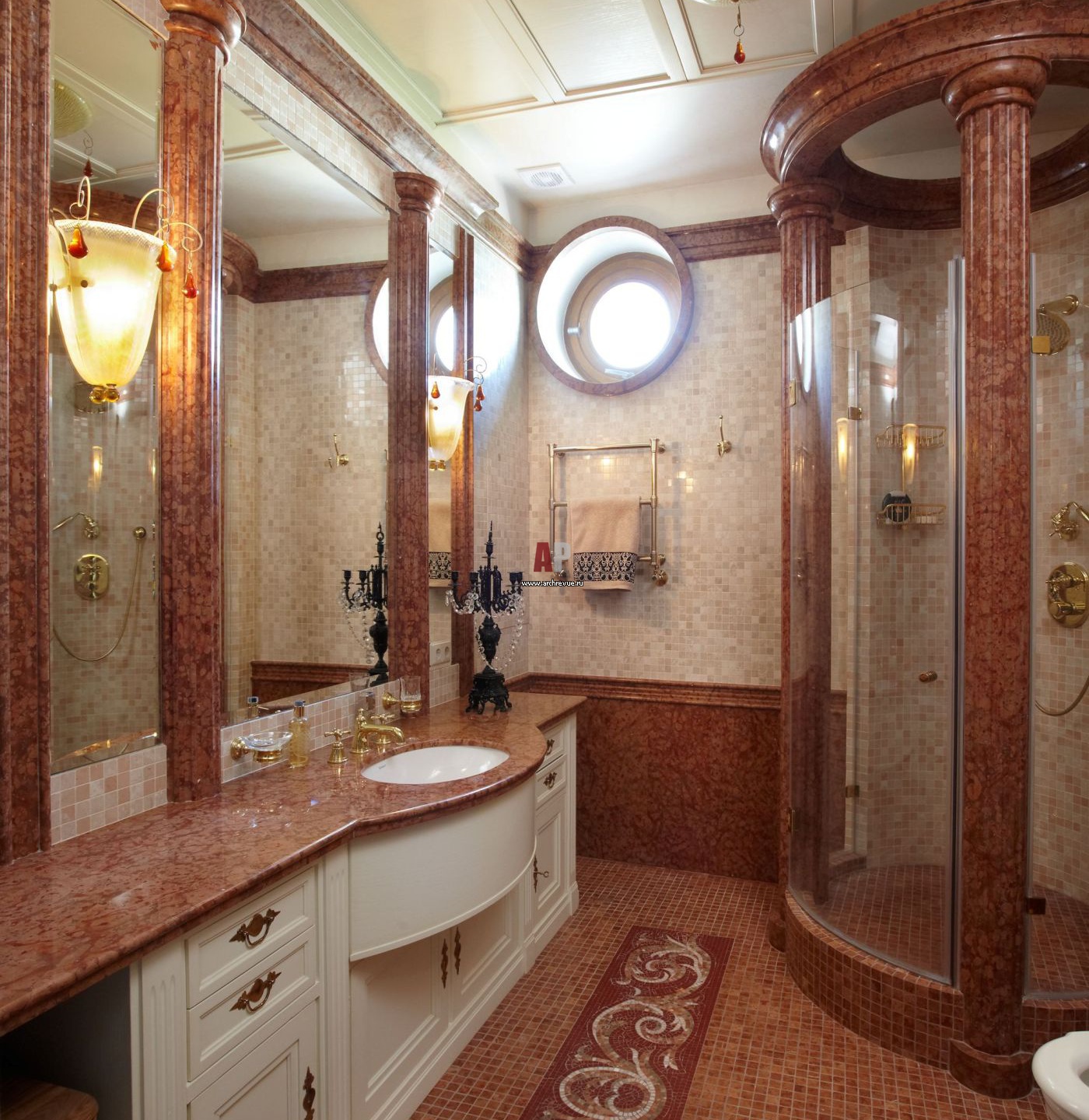 Душевая кабина создана по индивидуальным чертежам: колонны выполнены из мрамора, двери из гнутого стекла, изготовление «Стекло и мир». На полу – мозаичное панно из натурального камня, изготовление и поставка «Новый камень».