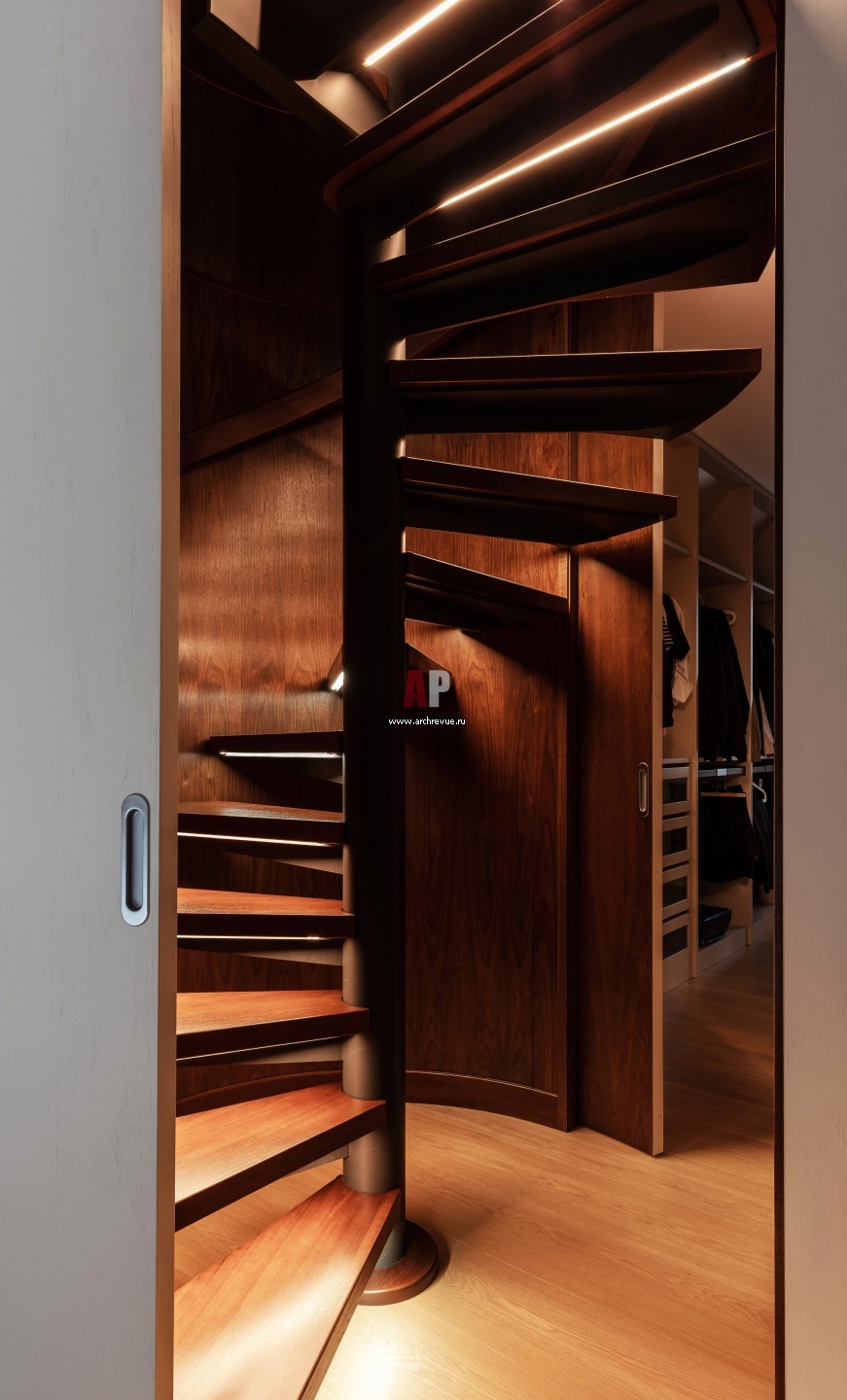 Винтовая лестница имеет два хода: из гардеробной при хозяйской спальне и непосредственно из холла второго этажа. Радиусные раздвижные двери позволяют перекрывать один из входов и делают его абсолютно незаметным.