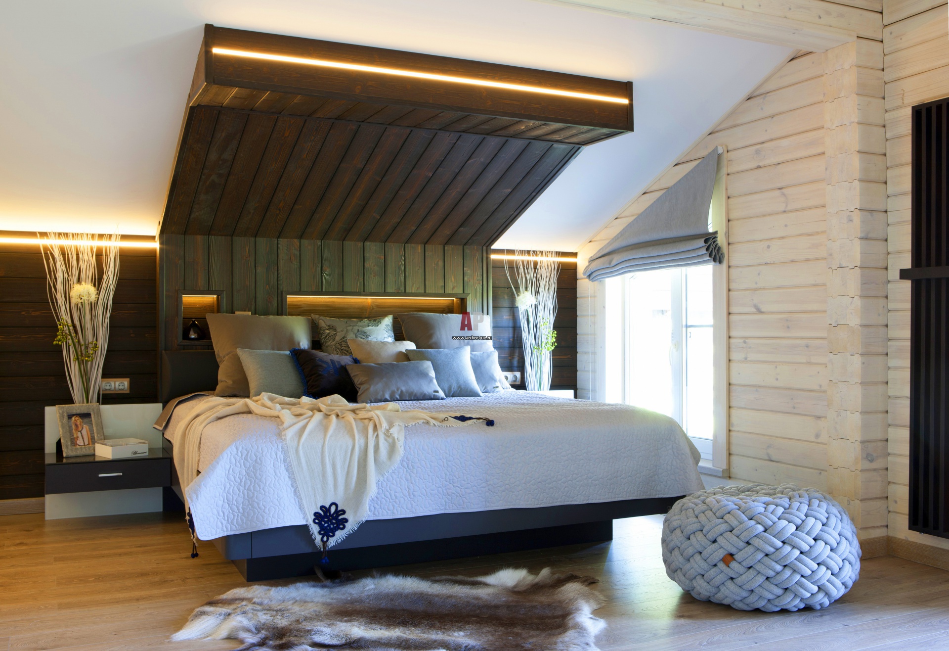 Хозяйская спальня. Хозяева хотели кровать с балдахином, но небольшая высота не позволила. Тогда дизайнер предложила сделать из термодревесины потолочную конструкцию, имитирующую балдахин. Кровать, Geha (модель Leonardo).