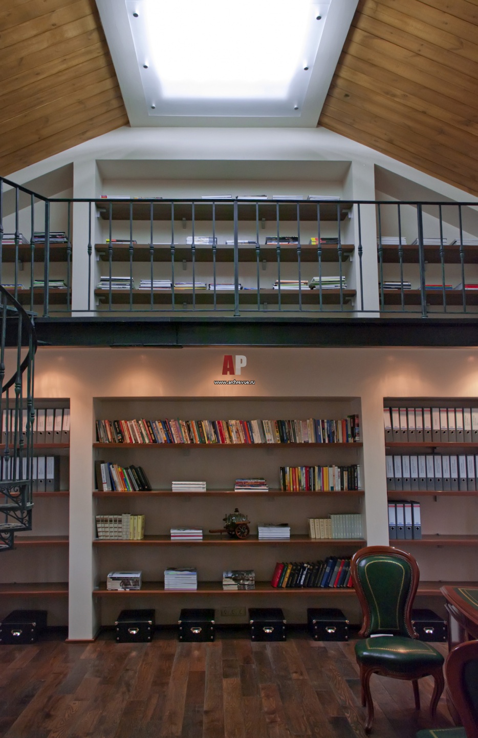 Высота помещения позволила надстроить антресоль, где разместилась библиотека и архив компании.