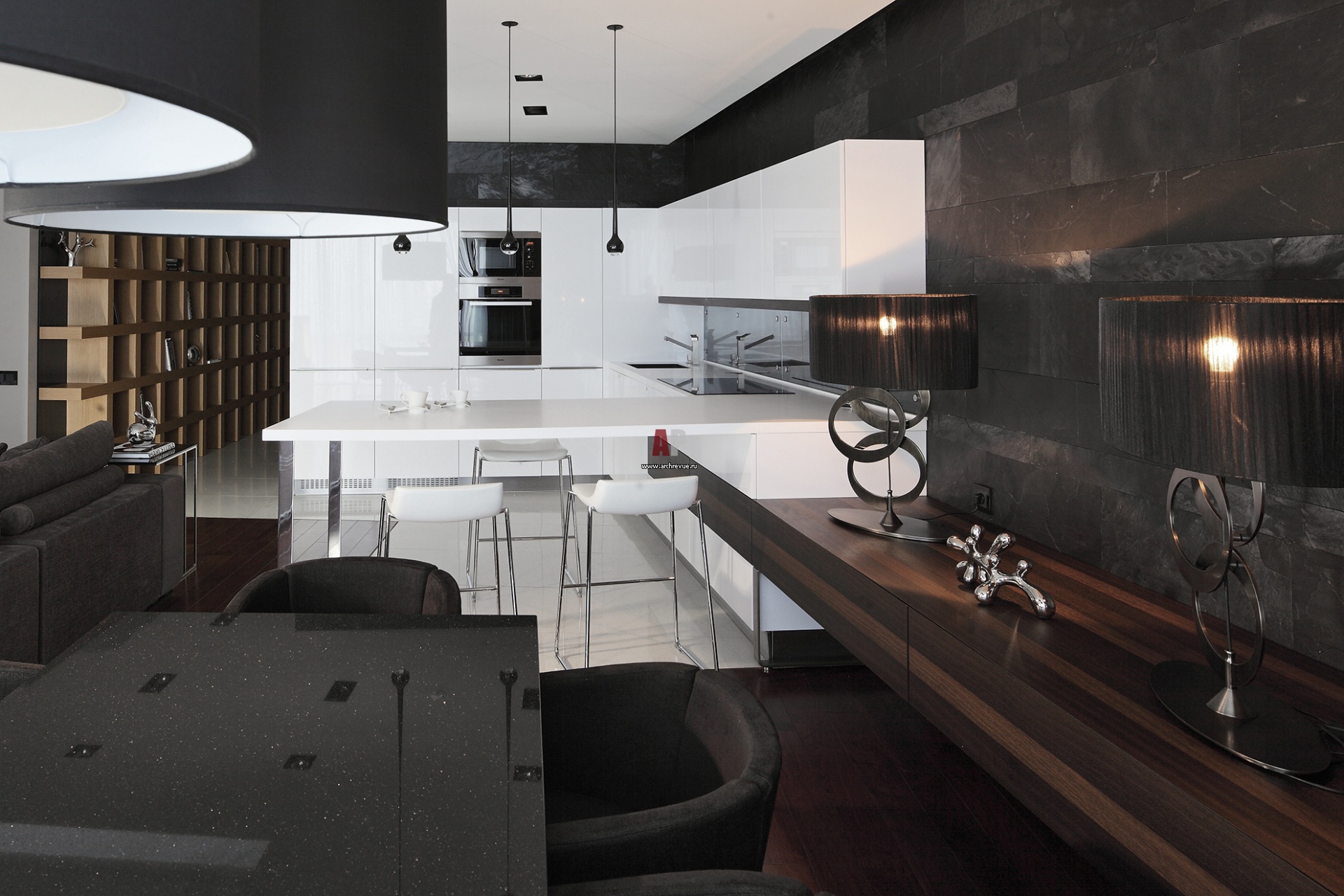 Кухня объединена с гостиной. С белоснежными глянцевыми фасадами кухни контрастирует стена, выложенная темным сланцем. Кухонный гарнитур, Rational.