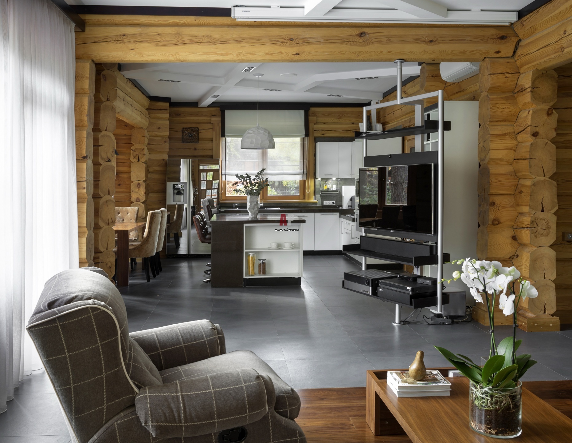 Кухня объединена в общий объем, от гостиной ее отделяет поворотная ТВ-стойка Porada. У заказчиков есть подобная в квартире, и они очень хотели, чтобы и в доме она присутствовала.