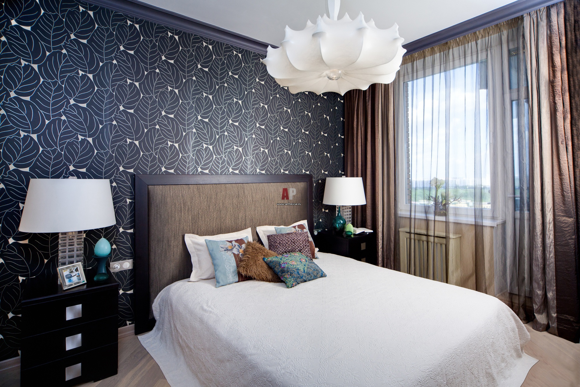 Спальня в современном стиле строится на контрасте черного и белого. Обои с активным рисунком, Osborne&Little с изображением листьев сочетаются с центральной модернистской люстрой.