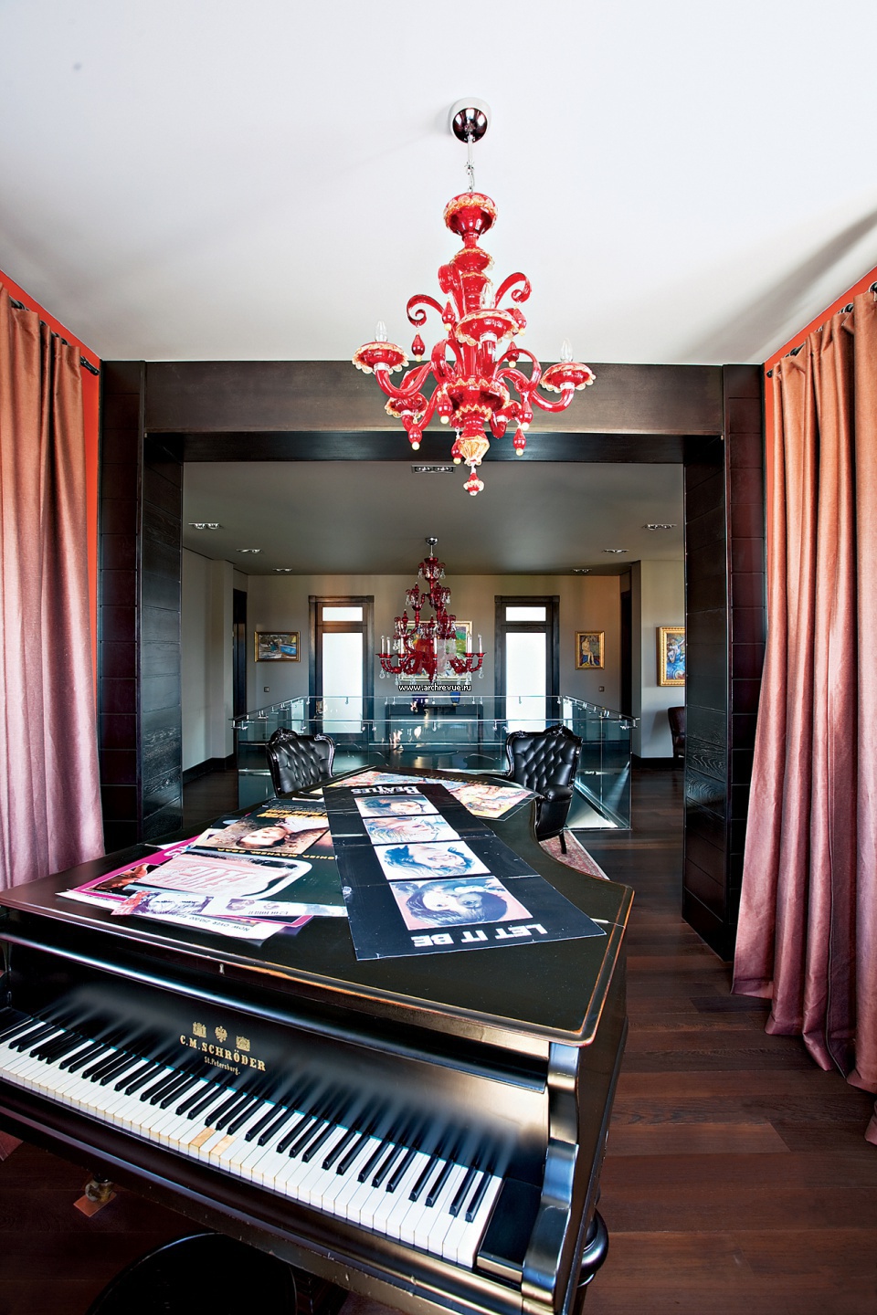 Интерьер музыкальной комнаты с роялем на втором этаже.