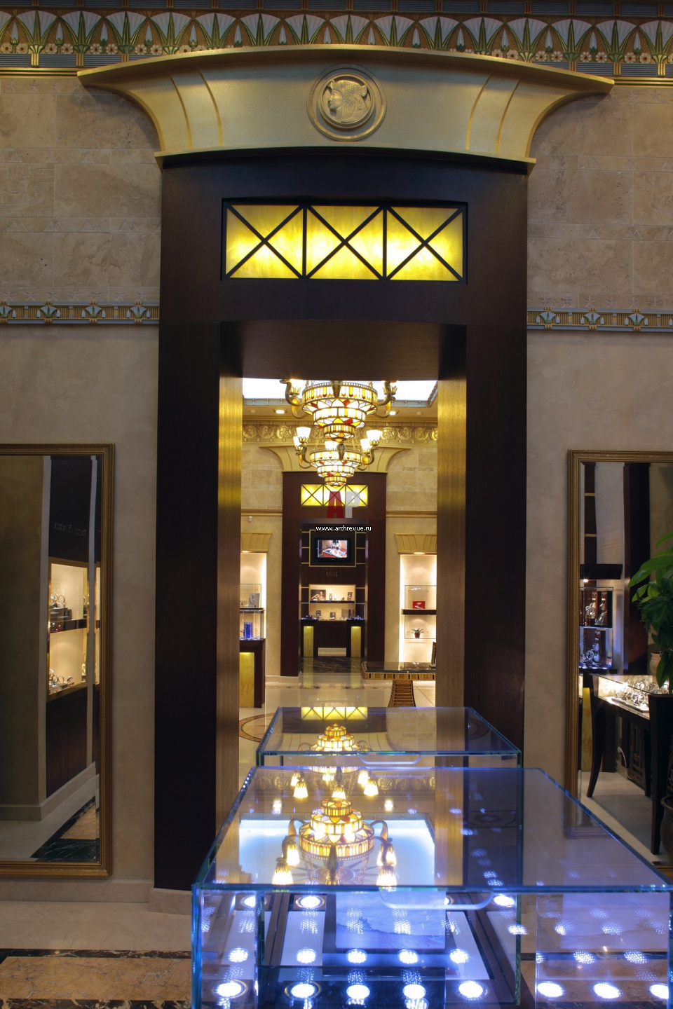 Архитектурное решение магазина – это система анфилад. Три торговых зала соединены между собой стилизованными египетскими порталами с витражами.