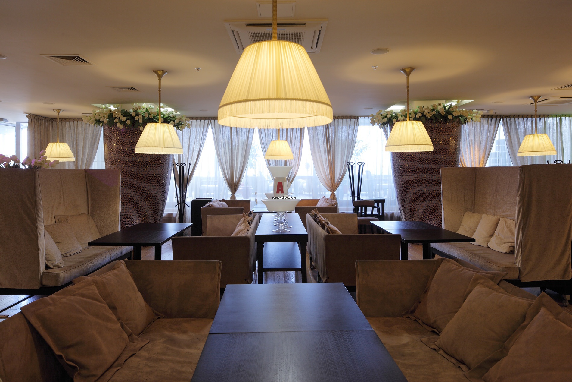 Главный элемент декора ресторана – четыре огромных напольных вазы с цветами, которые маскируют конструктивные колонны.