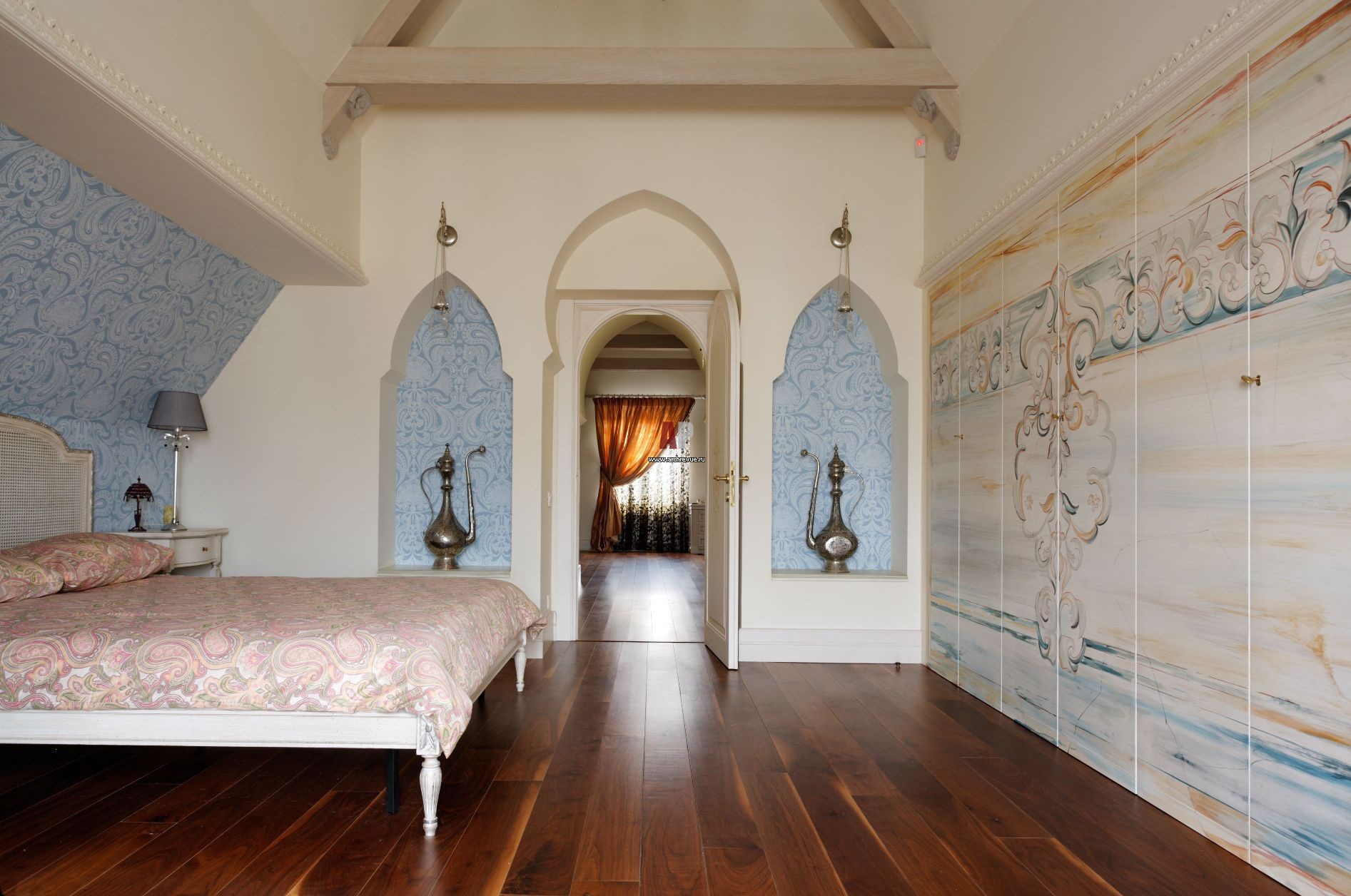 Апартаменты ребенка занимают третий этаж. Они включают спальню и гостиную-кабинет с письменным столом. Стены частично декорированы виниловыми обоями Richmond. Встроенный шкаф украшен росписью.