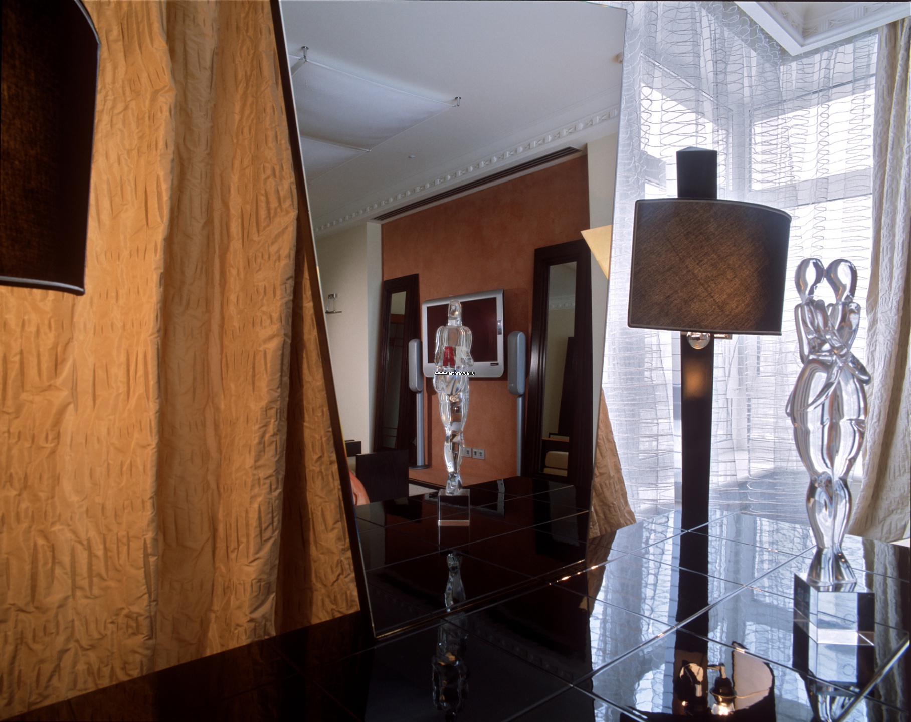 Фрагмент интерьера спальни. Терракотовый текстиль рифмуется с декоративными покрасками. Коллекция авторского хрусталя настраивает на возвышенный лад.