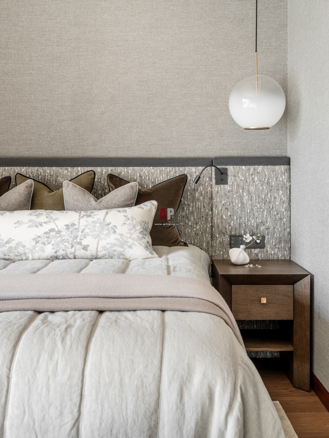 Спокойная квартира с многослойным интерьером. Спальня хозяев. Кровать с удлиненным изголовьем в ткани Pierre Frey. Прикроватные тумбы по эскизам дизайнера. Подвесной светильник, Venicem.