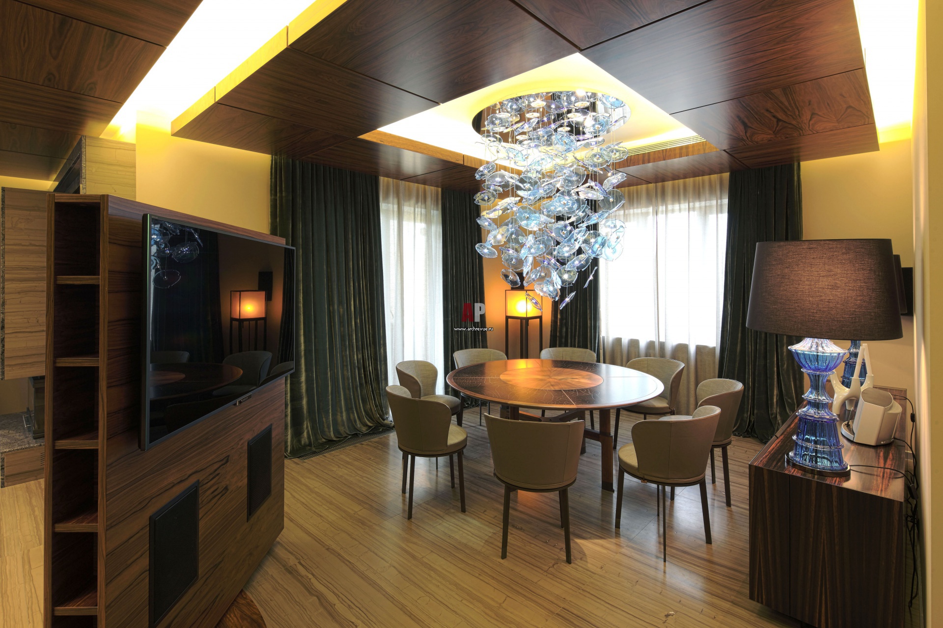Современный интерьер столовой в отделке деревом. Массивные потолочные карнизы и двухсторонняя стойка ТВ выполнены из палисандра. Работы по дереву, компания «АФ Ника».