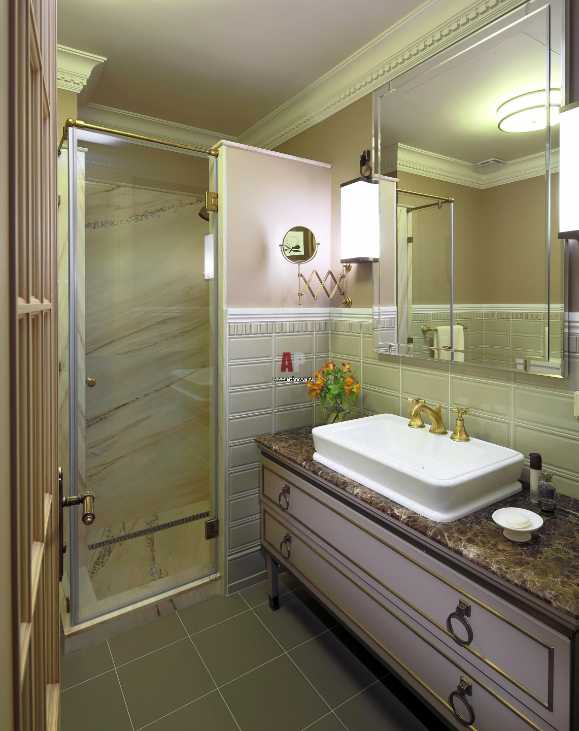 Интерьер ванной комнаты в усадьбе. Стена в душевой кабине облицована ониксом. Столешница умывальника выполнена из мрамора Emperador Dark.