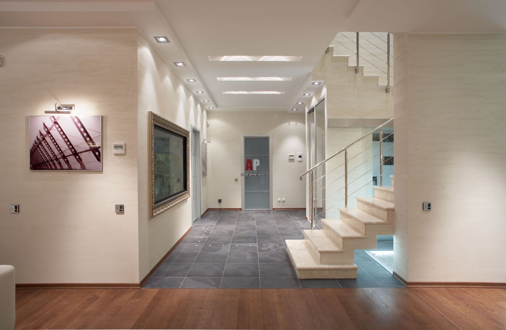 Интерьер холла акцентирован несколькими ключевыми элементами: воздушной лестницей, выполненной по авторскому эскизу, компания «Литосфера », и двусторонним аквариумом (одна сторона выходит в кухню), обрамленным золоченым багетом.