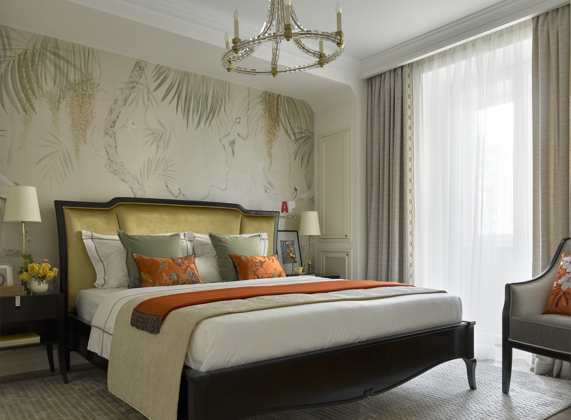 Спальня бабушки выполнена в золотисто-терракотовых тонах. Обои с ручной росписью с изображением журавлей, Fresq. Кровать, LCI Stile. Тумбочка, Selva. Светильники, Visual Comfort & Co.