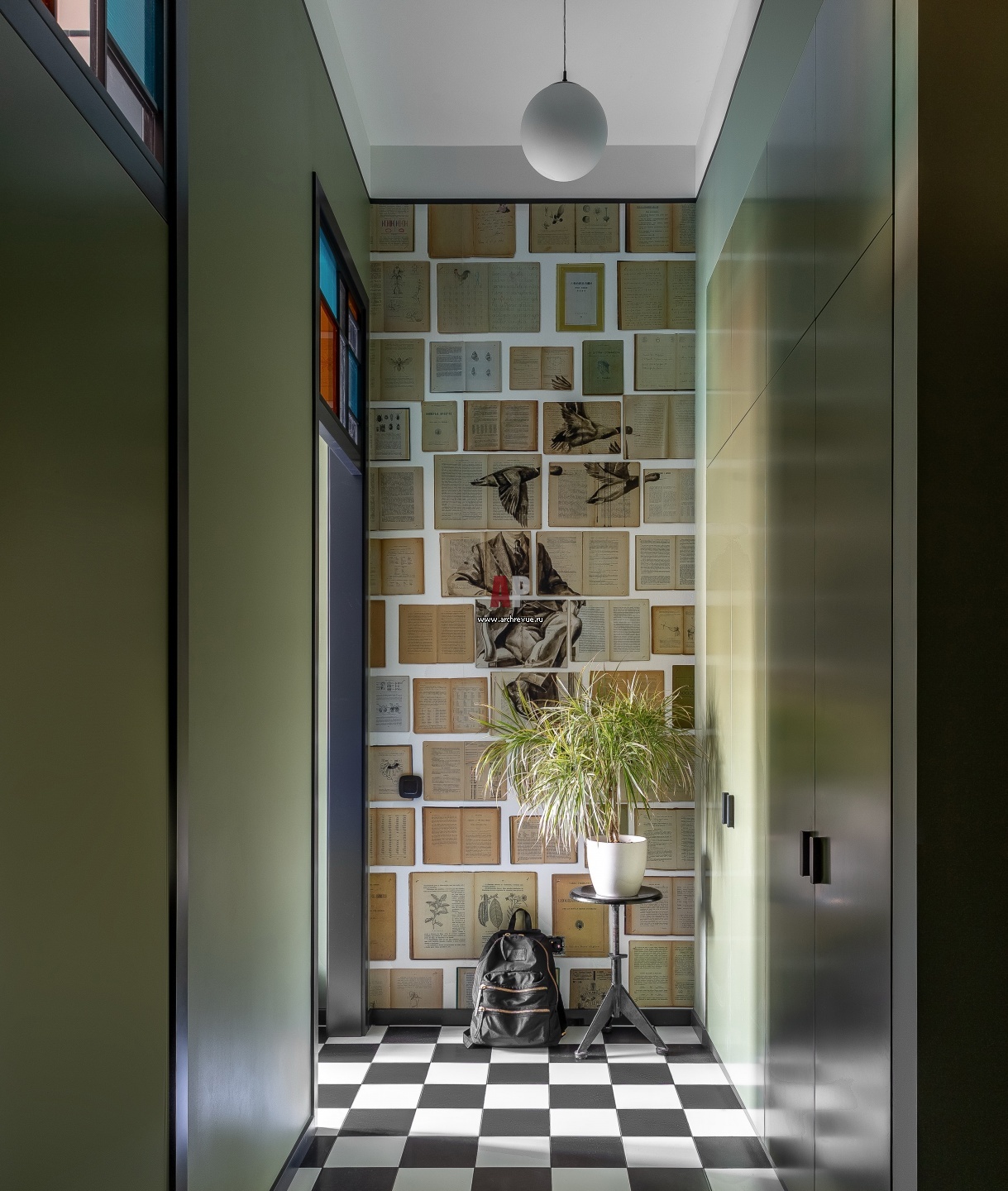 Интерьер входной группы. Фасады встроенной мебели выкрашены в однотонный оливково-зеленый цвет. Торцевая стена оклеена обоями с изображением страниц из старых фолиантов. На полу – черно-белая плитка в шахматной раскладке.