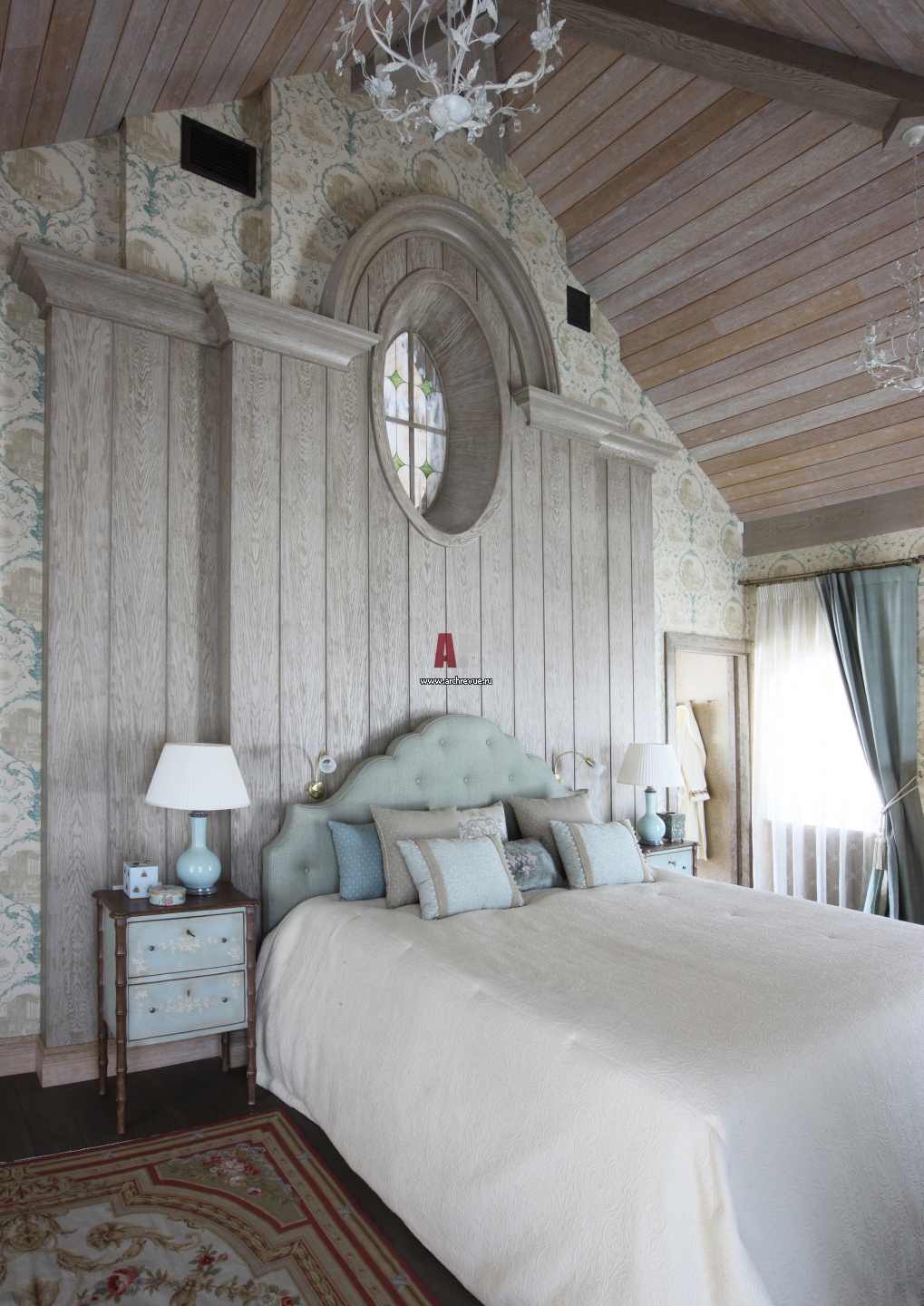 Декор хозяйской спальни строится элегантном сочетании пыльно бирюзового и сливочно-кофейного оттенков с выразительным рисунком обоев Zoffany. Стена за изголовьем кровати в спальне акцентирована деревянным порталом с круглым окном-витражом.