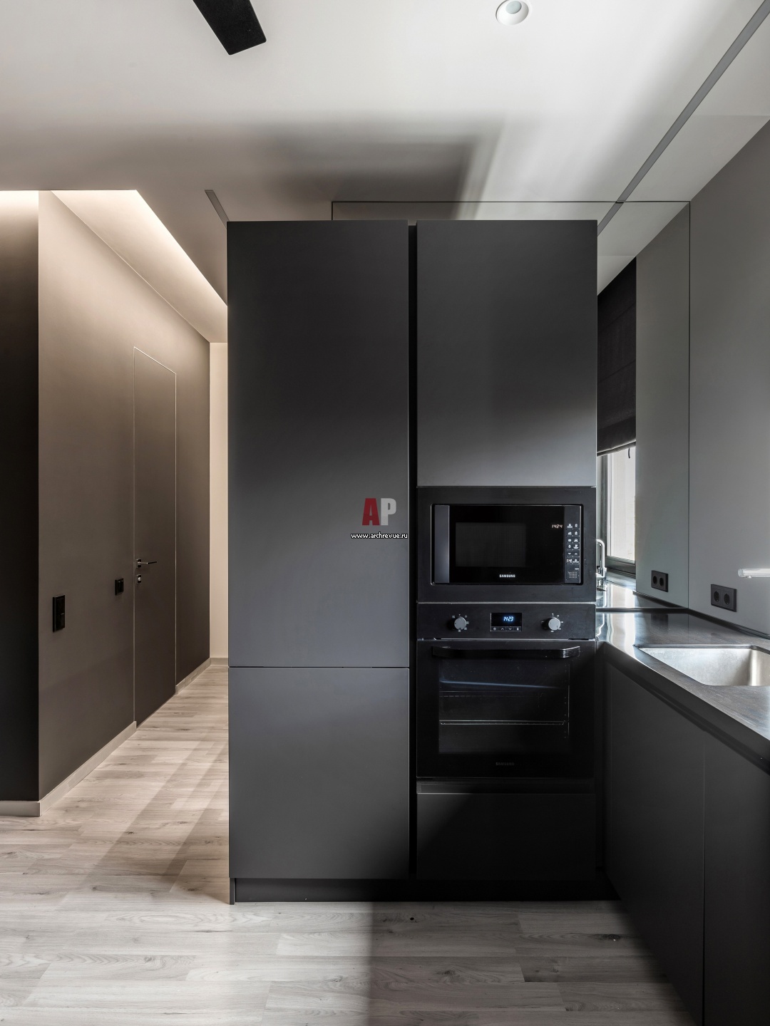 Чтобы визуально облегчить колонны, архитекторы установили кухонные колонны с 20 сантиметровым отступом от потолка. Карниз и примыкающую к окну часть сделали зеркальными. Так удалось избавиться от ощущения, что здесь стоит огромная конструкция.