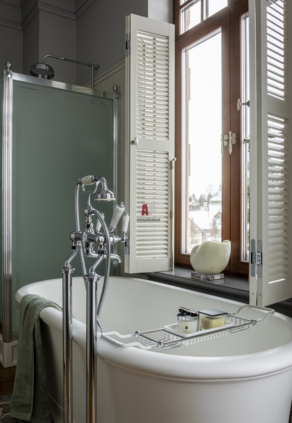 Ванная комната хозяйки. Ставни-жалюзи изготовлены на заказ. Сантехника, Devon & Devon.