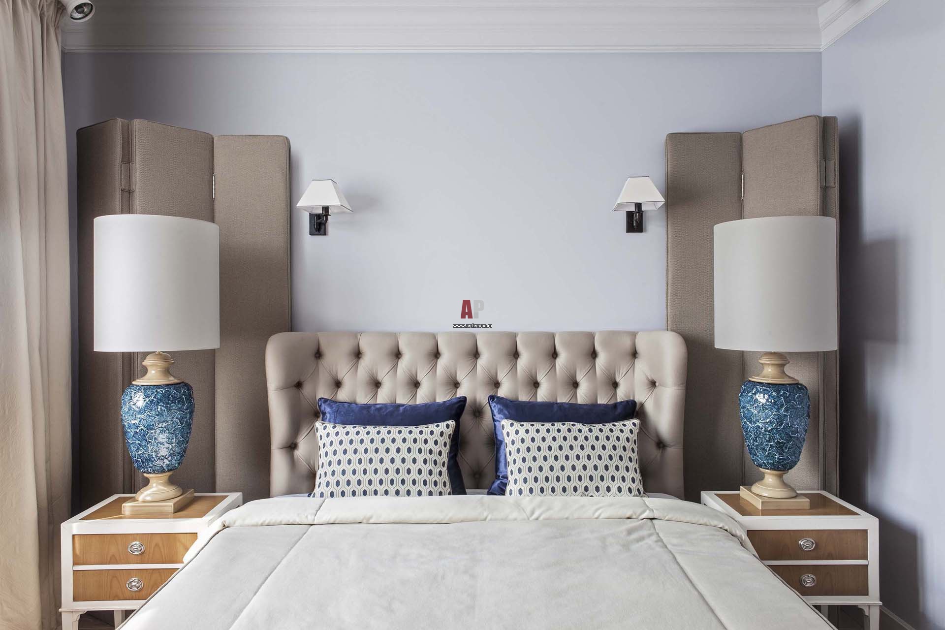 Интерьер спальни выдержан в бежево-синих пастельных тонах. Изголовье кровати от Meridiani обито тканью с каретной стяжкой. Тумбы, Bizzotto.