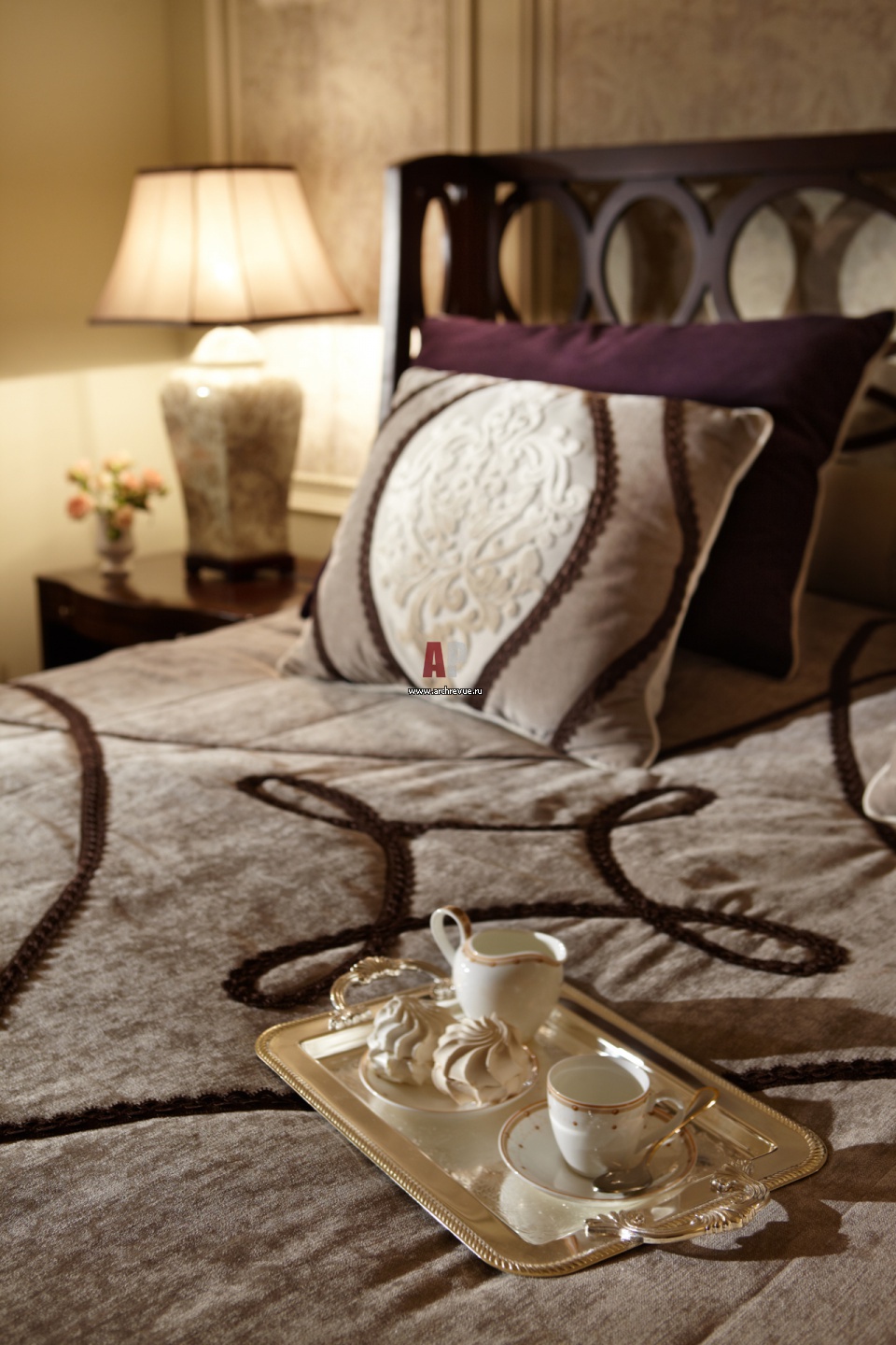 Фрагмент интерьера спальни. Покрывало и подушки украшены декоративным кантом.