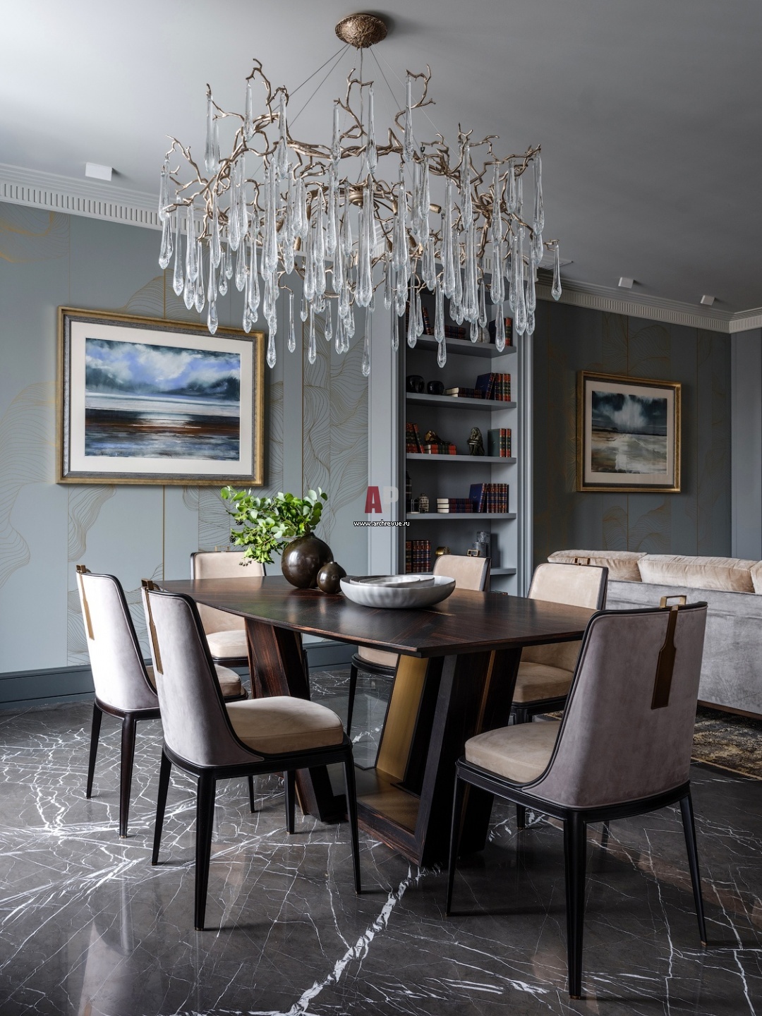 Обеденная группа в общей гостиной. Стол и стулья из первой мебельной коллекции Олега Клодта и Анны Агаповой, O&A London. Люстра, Louise Bradley.