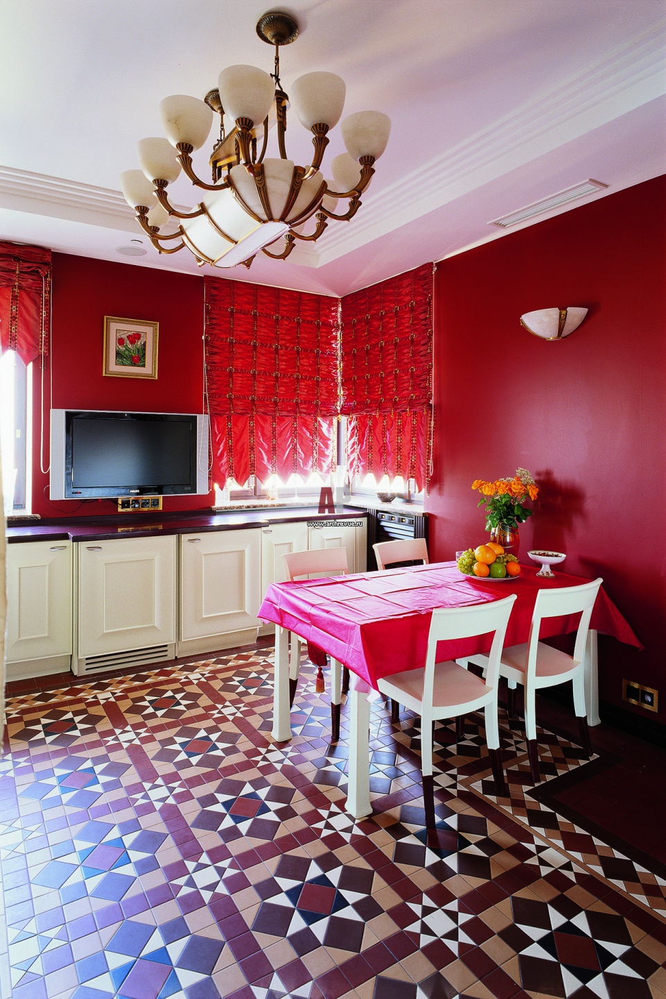 Кухня занимает отдельное помещение. Она решена в насыщенном красном цвете. Палитру задала английская терракотовая плитка, оттенок которой поддержан цветом стен и штор. Кухонный гарнитур Snaidero.