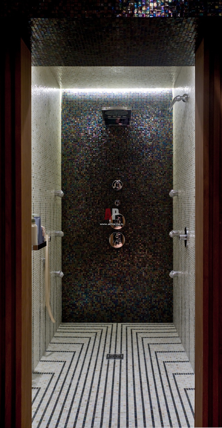 Душевая кабина с гидромассажем при банном комплексе в цокольном этаже.