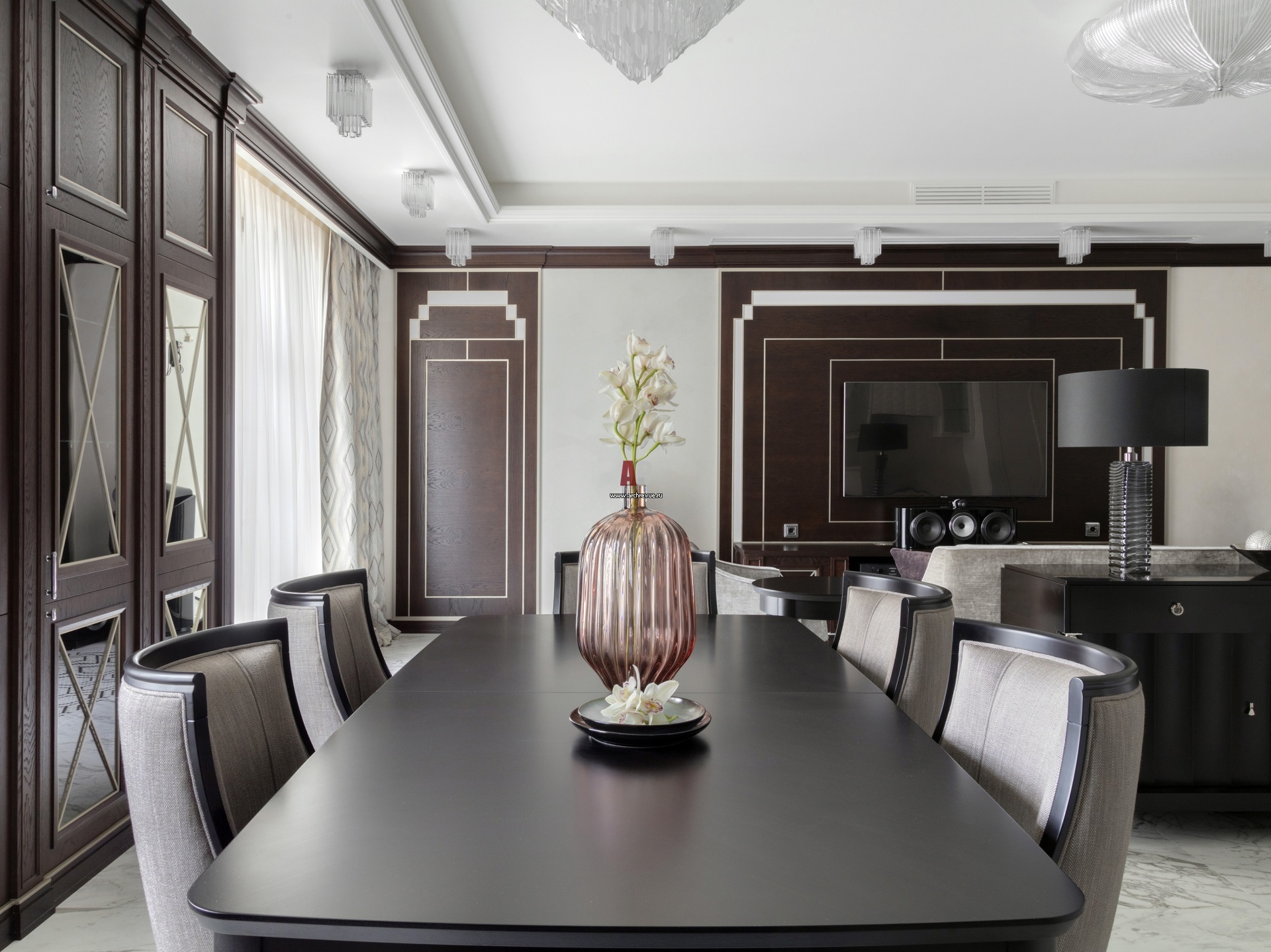 Контрастный интерьер в стиле ар-деко. Гостиная-столовая.