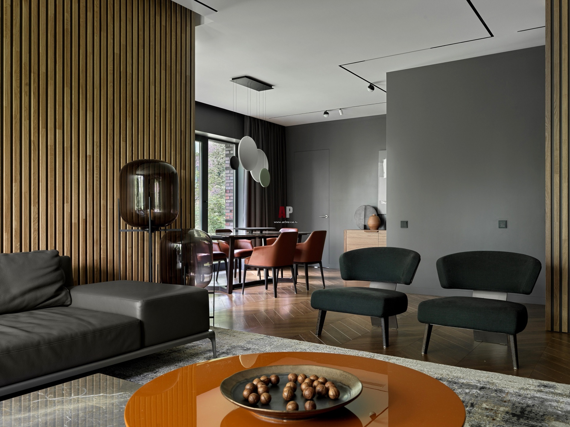 Кухню из диванной зоны не видно, она спрятана за колонной.