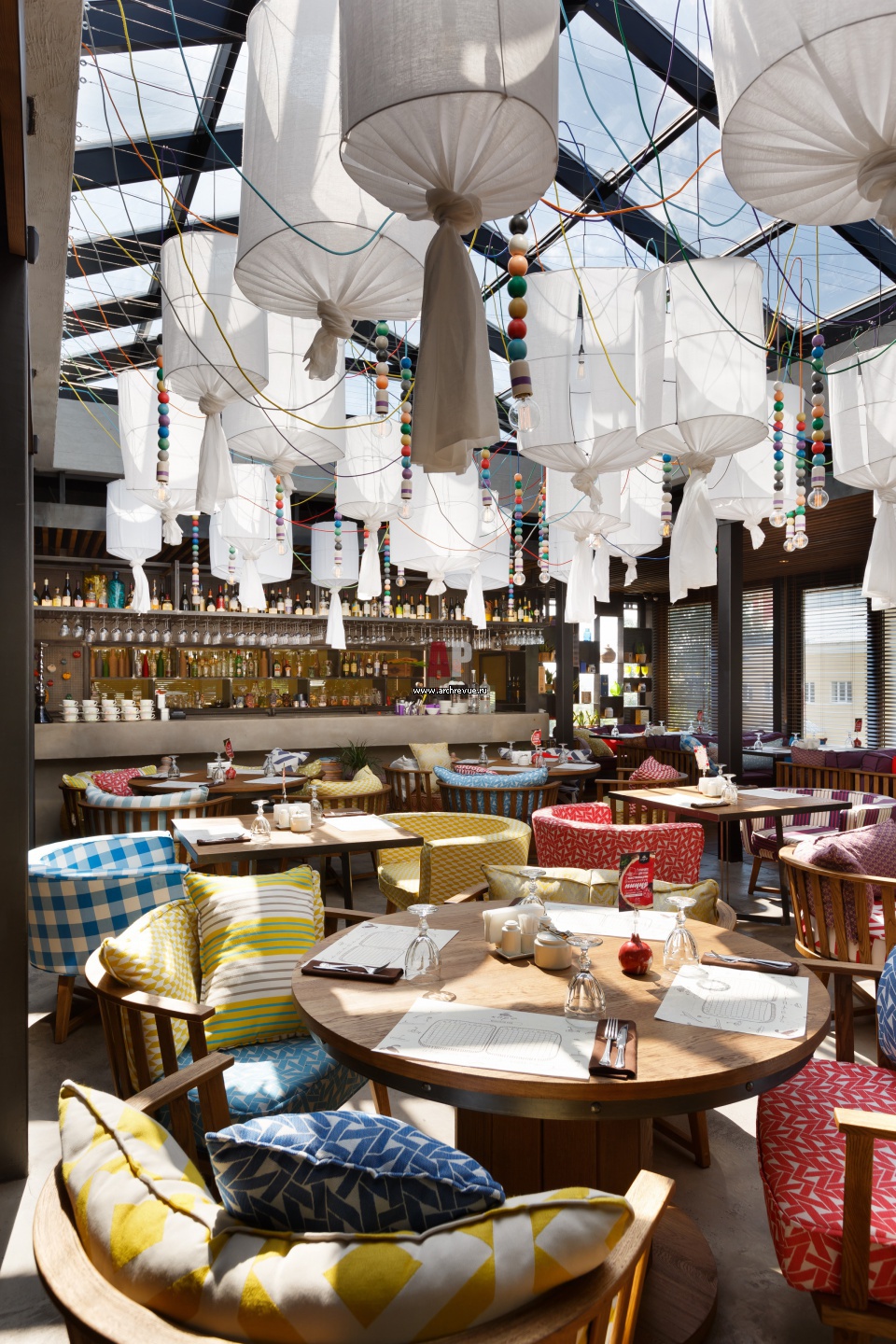 Зал обставлен удобной мебелью, выполненной по авторским эскизам с учетом тенденций в области современной террасной мебели. Живые растения вносят дополнительные краски и «оживляют» интерьер.