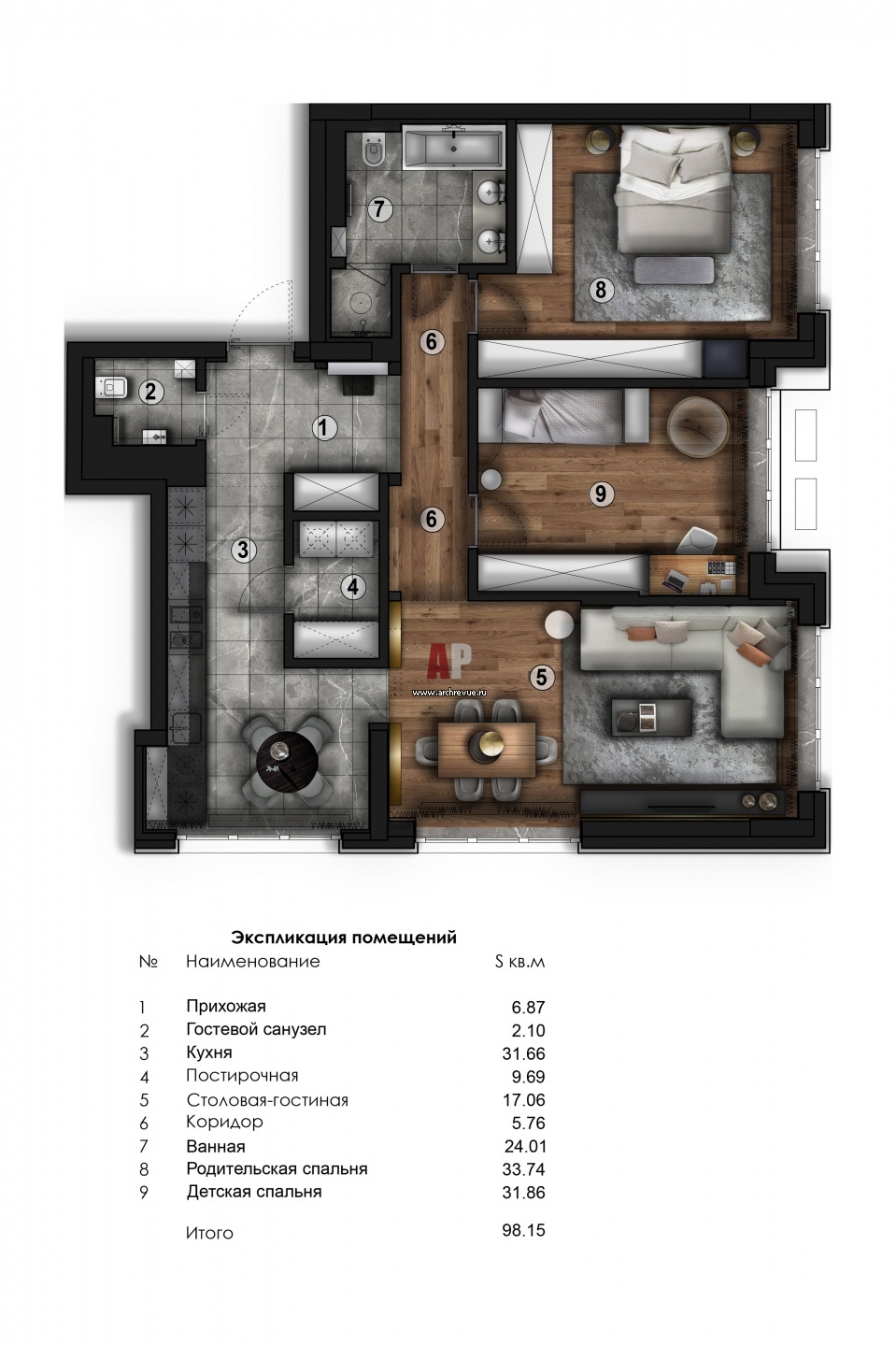 План трехкомнатной квартиры для молодой семьи в ЖК Red Side. Общая площадь – 101 кв. м.