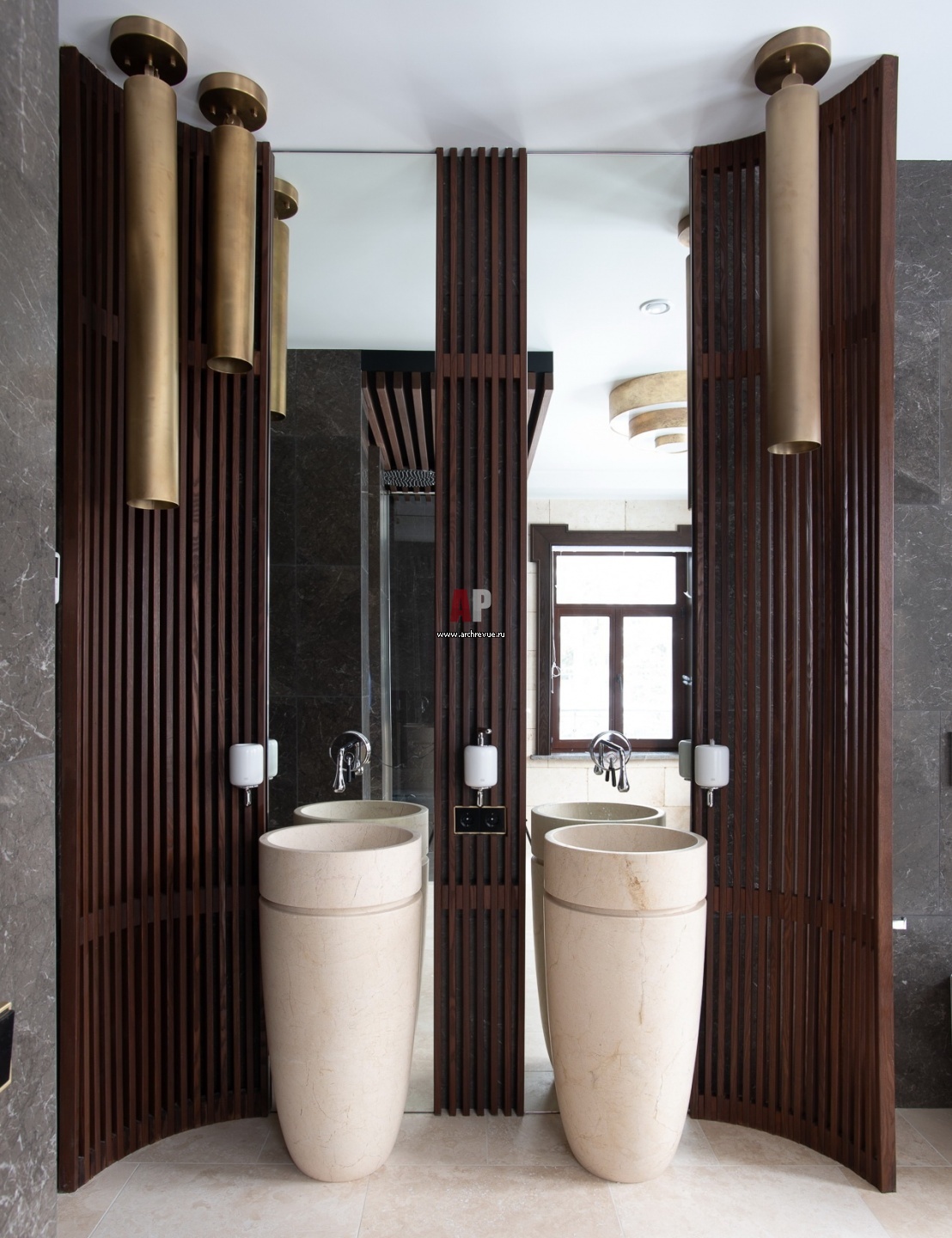 Женская ванная комната с полукруглой зоной умывальника. Напольные каменные раковины, камень в отделке стен и пола, L’Antic Colonial.