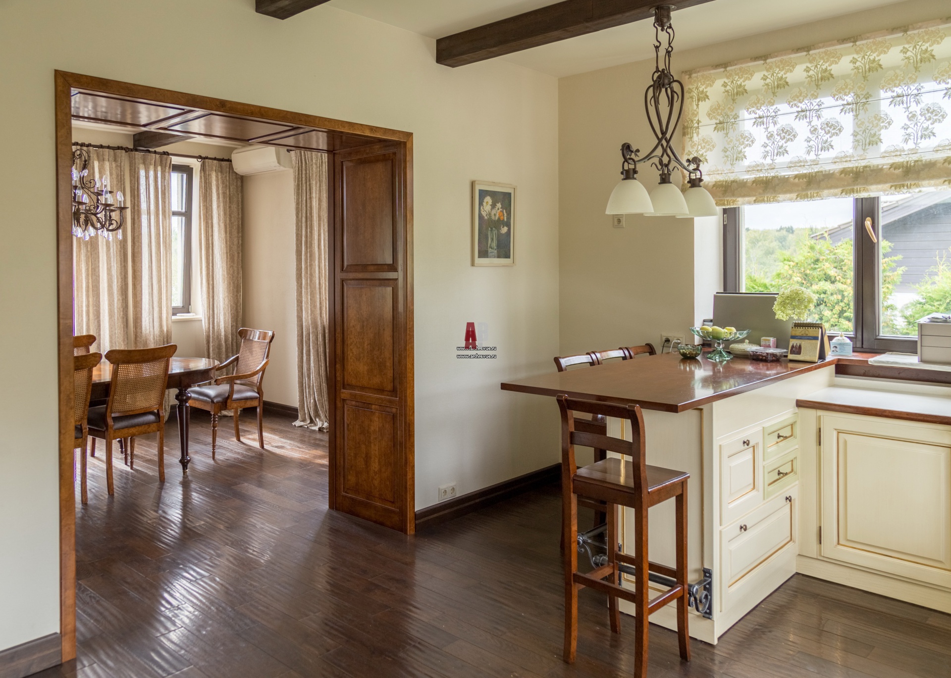 Интерьер общей зоны решен на контрасте светлых стен и темного пола, плинтусов, оконных рам, дверных порталов. Ставка сделана на натуральные материалы природные фактуры: светлый камень, широкую половую доску из тонированного дуба с грубой фактурой, живую структуру деревянной кладки.