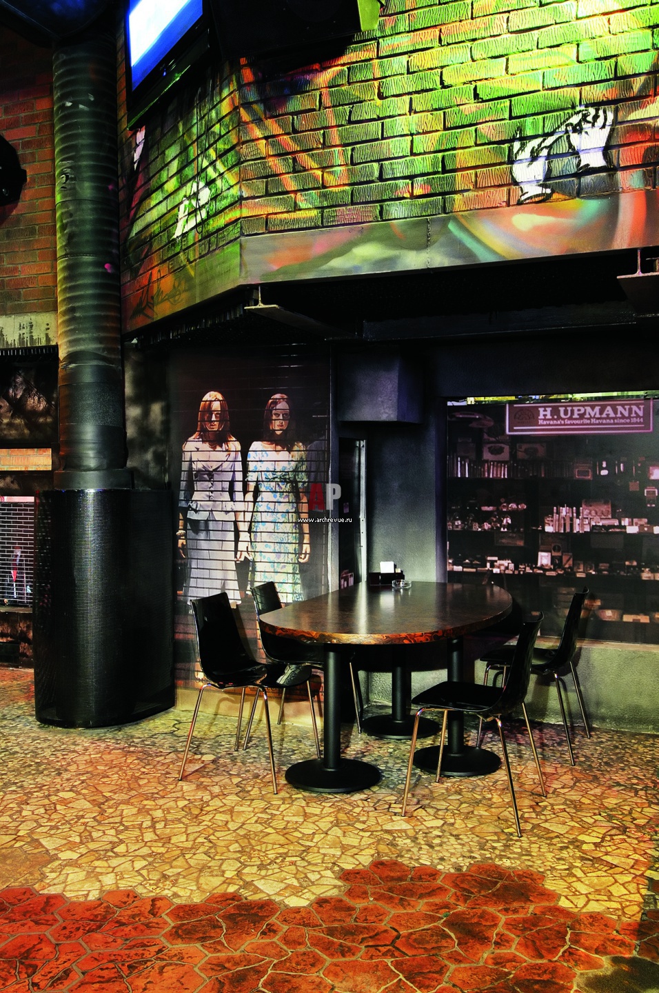 Стены зала отделаны темным кирпичом и расписаны граффити, пол сделан как уличный асфальт с дорожной разметкой и каменной мостовой.