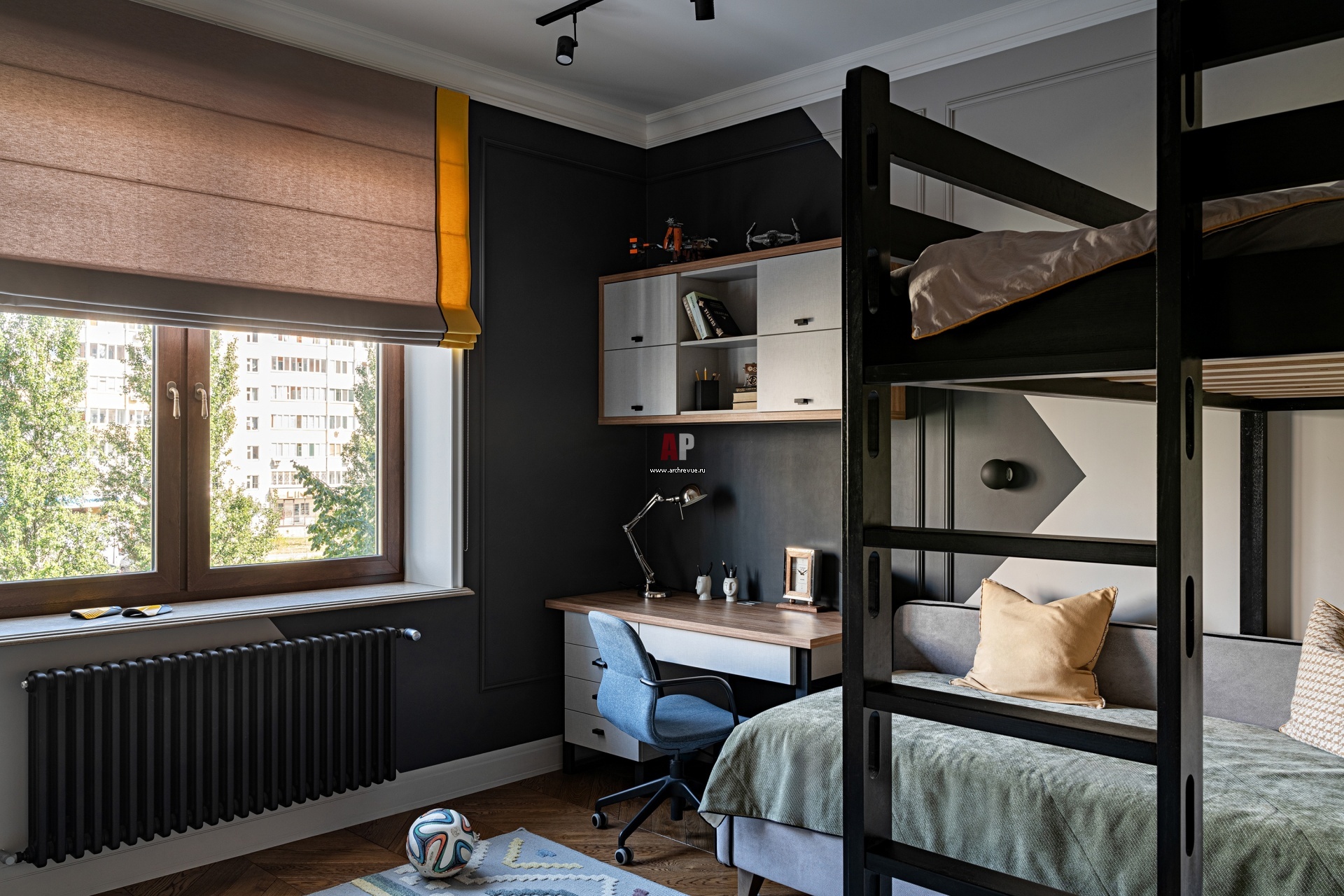 Детская сына. Его основным пожеланием был второй ярус кровати. Дизайнер его расположила так, чтобы со временем его можно было легко демонтировать без глобального ремонта. Краска, Little Greene. Кровать, Shikana furniture factory. Корпусная мебель выполнена на заказ. Бра для чтения на «втором этаже» находится на одной высоте с подсветкой стеллажа на случай замены
