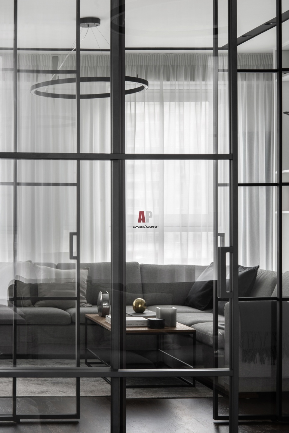 Интерьер серой 3-х комнатной квартиры со стеклянной перегородкой в Сколково
