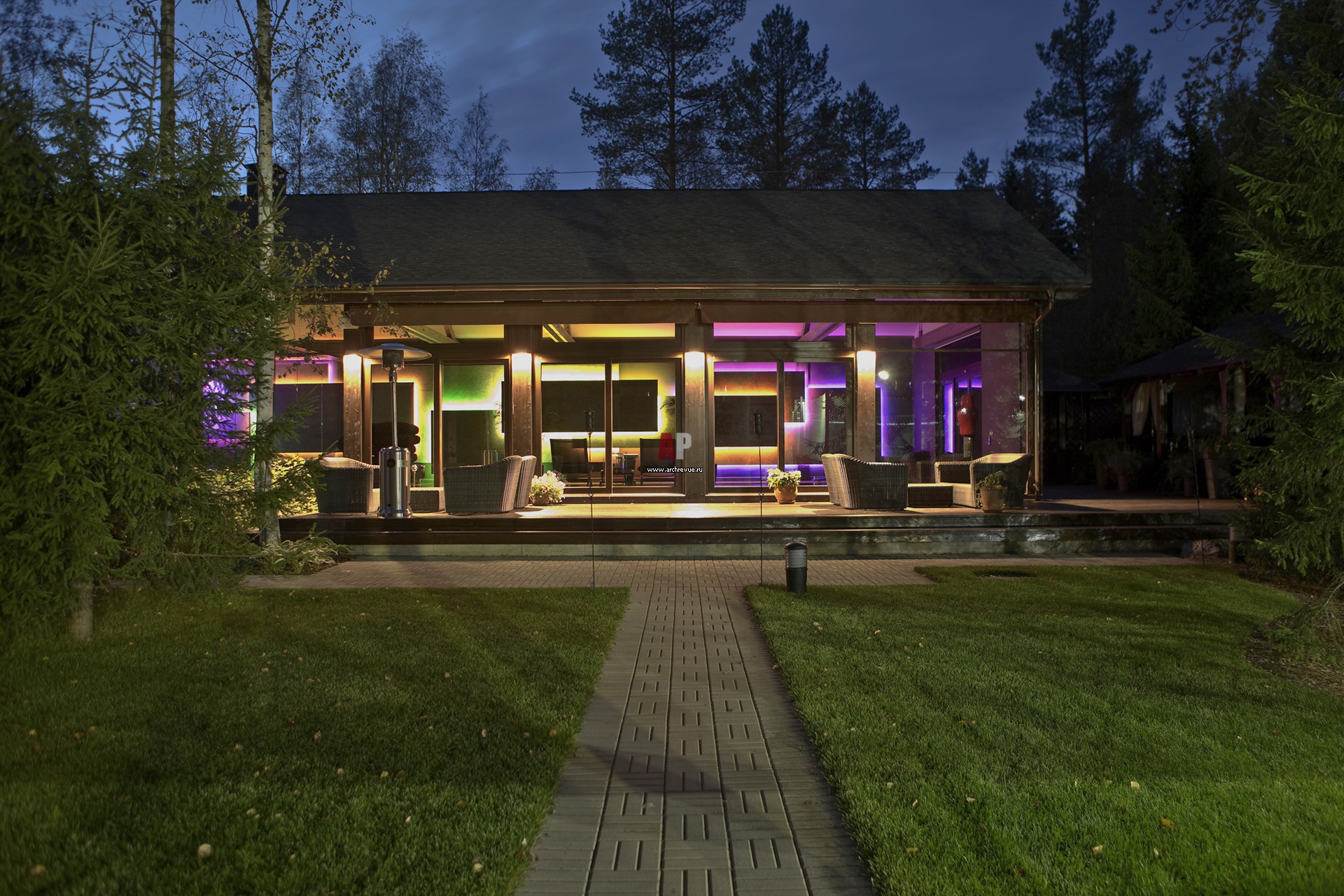 Фото фасада двухэтажного комплекса с бассейном. Световые панно из сланца в RGB-подсветкой в темноте выглядят как светодинамическая скульптура.