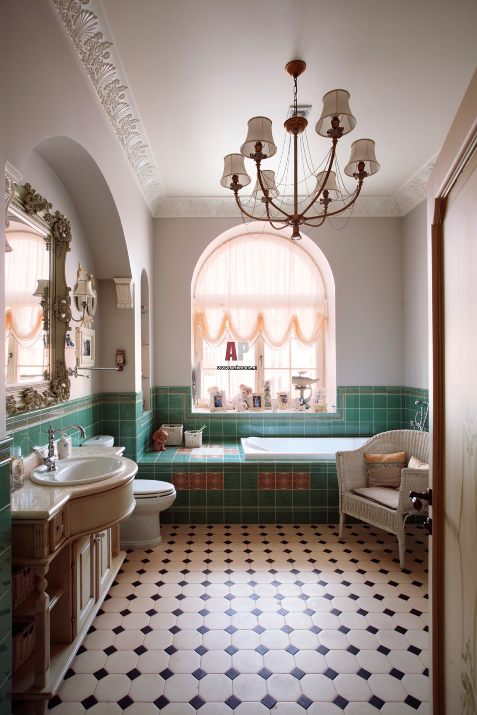 Фото интерьера детского санузла. Помещение оформлено глазурованной керамической плиткой в английском стиле, поставщик «Интерьерный салон» ( «Биг Бен» ).