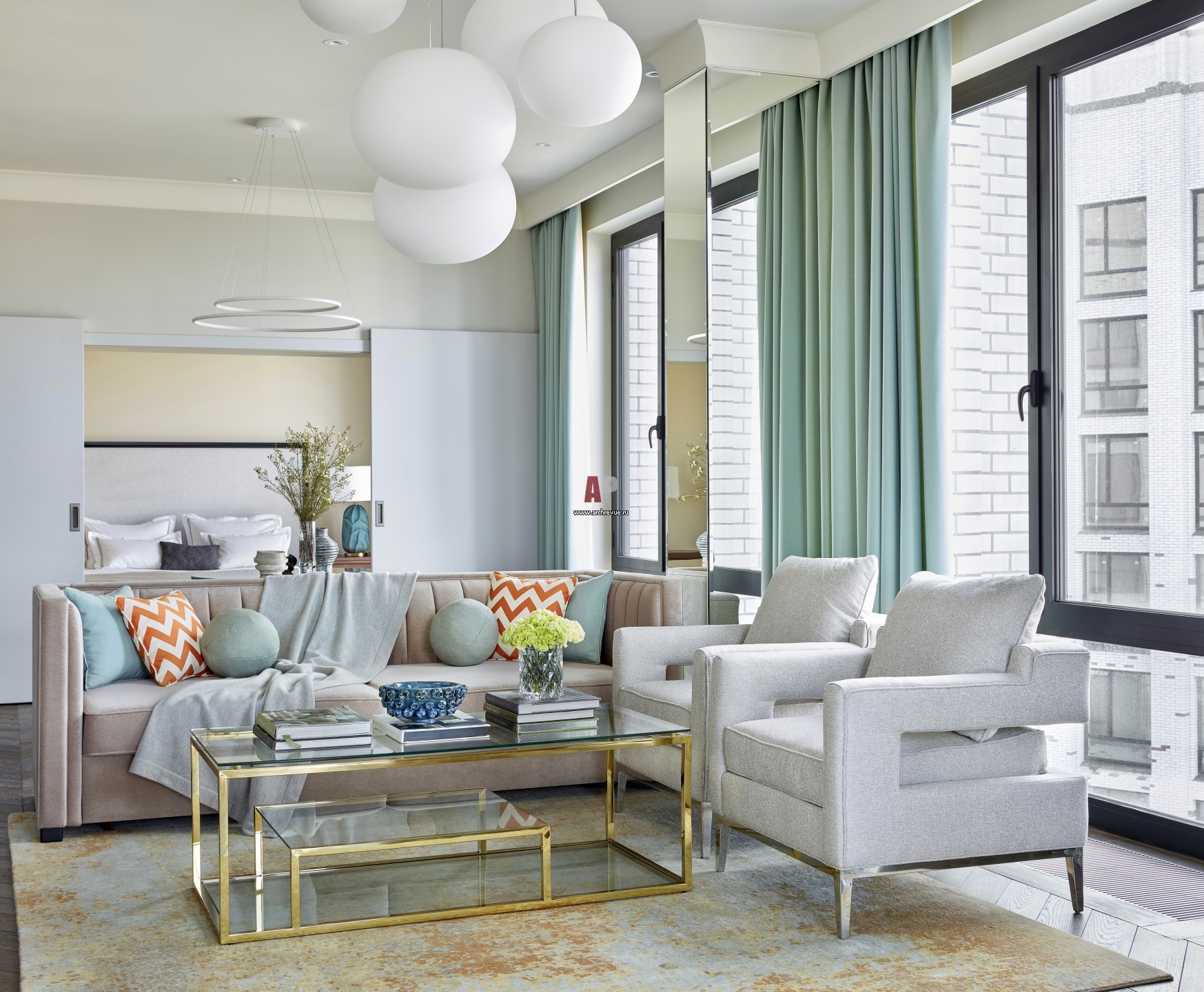 После перепланировки в гостиной осталась колонна с коммуникациями (застройщик предлагал сделать здесь панорамный санузел), которую облицевали зеркальными панелями и «растворили» в интерьере.