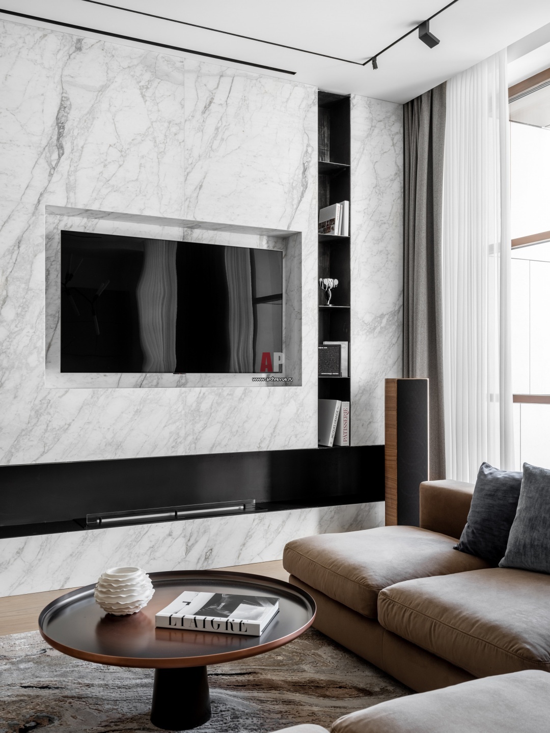Гостиная Мебельная композиция для ТВ выполнена из мрамора Calacatta Gold. Трековая система на магнитах, Eden Design.