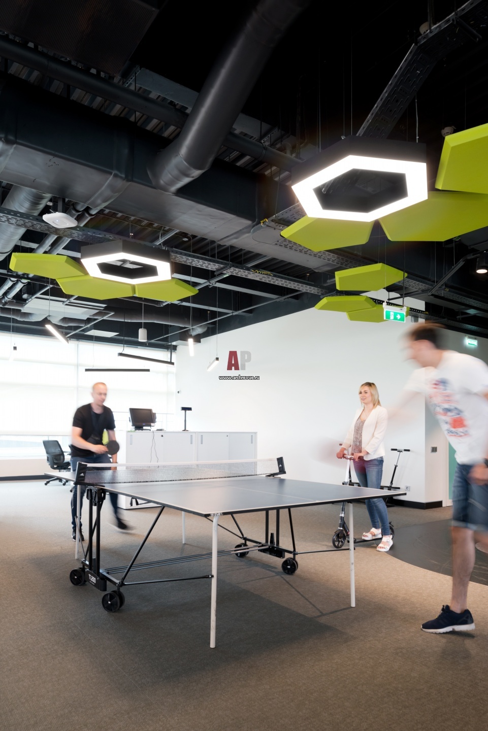 Офис компании Adidas Group. Интерьер зоны отдыха. Форма подвесного потолка и световой шины в виде сот – отсылка к выкройке классического футбольного мяча.