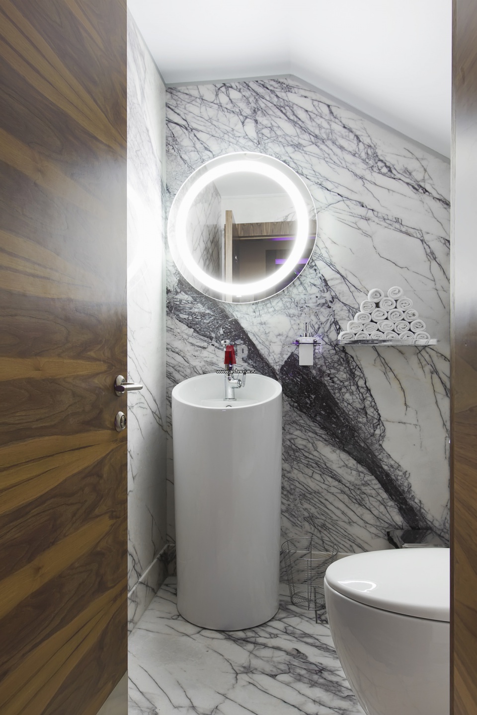 Интерьер санузла : полы и стены облицованы былым мрамором LILAC. Входная дверь из американского ореха.