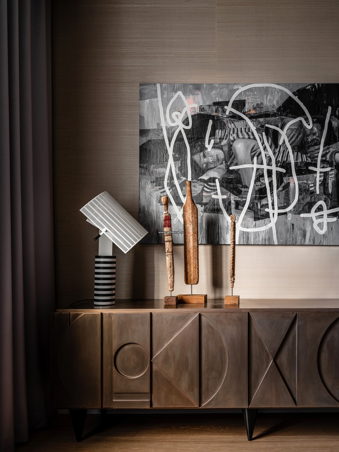 Тумба изготовлена на заказ по чертежам дизайнера. На ней – скульптура, ваза и арт-объект Евгения Антуфьева. Живопись Марата Марика. Лампа, Artemide.