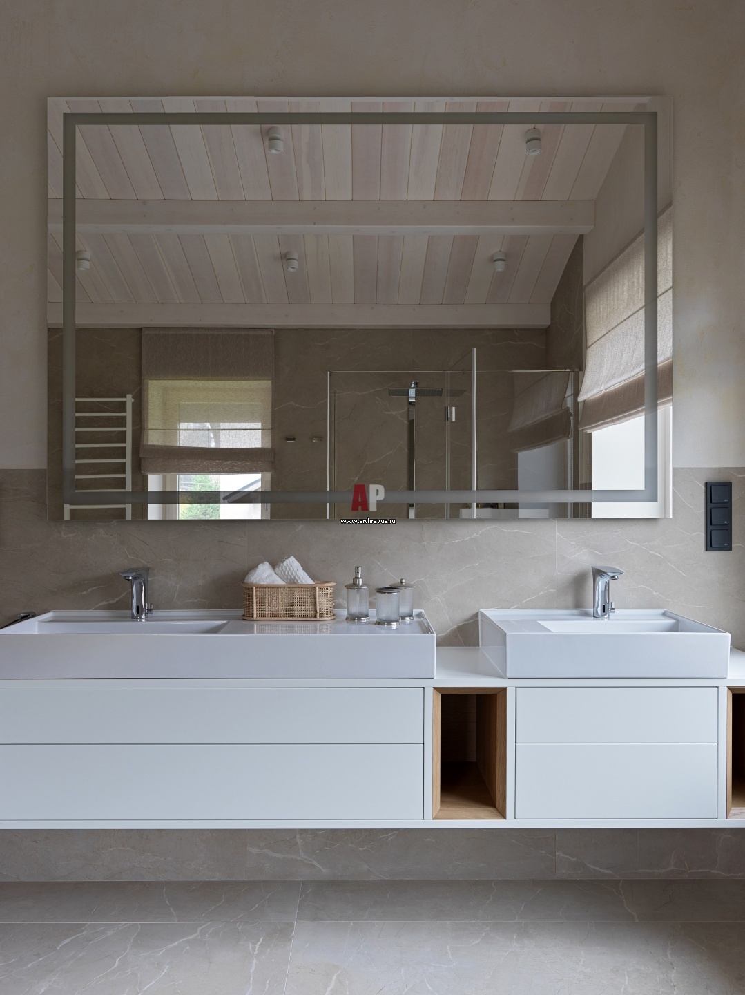 Хозяйский санузел. Умывальник с двумя раковинами сделана на заказ. Смесители, Hansgrohe.