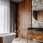 Хозяйская ванная комната с большим окном. Панели встроенный шкаф из шпона ореха. Напольная плитка, Atlas Concorde. Вся мебель и отделка панелями выполнены на заказ. Отдельностоящая ванна, Gessi.