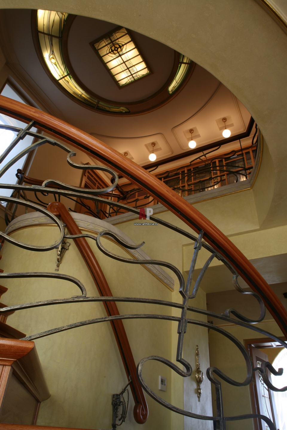 Парадная лестница пронзает все четыре уровня квартиры. Кованое ограждение в стиле ар-нуво выполнено по эскизам декоратора мастером по металлу Вячеславом Пастушковым. Потолочный витраж на верхнем уровне остался от предыдущей жизни квартиры.